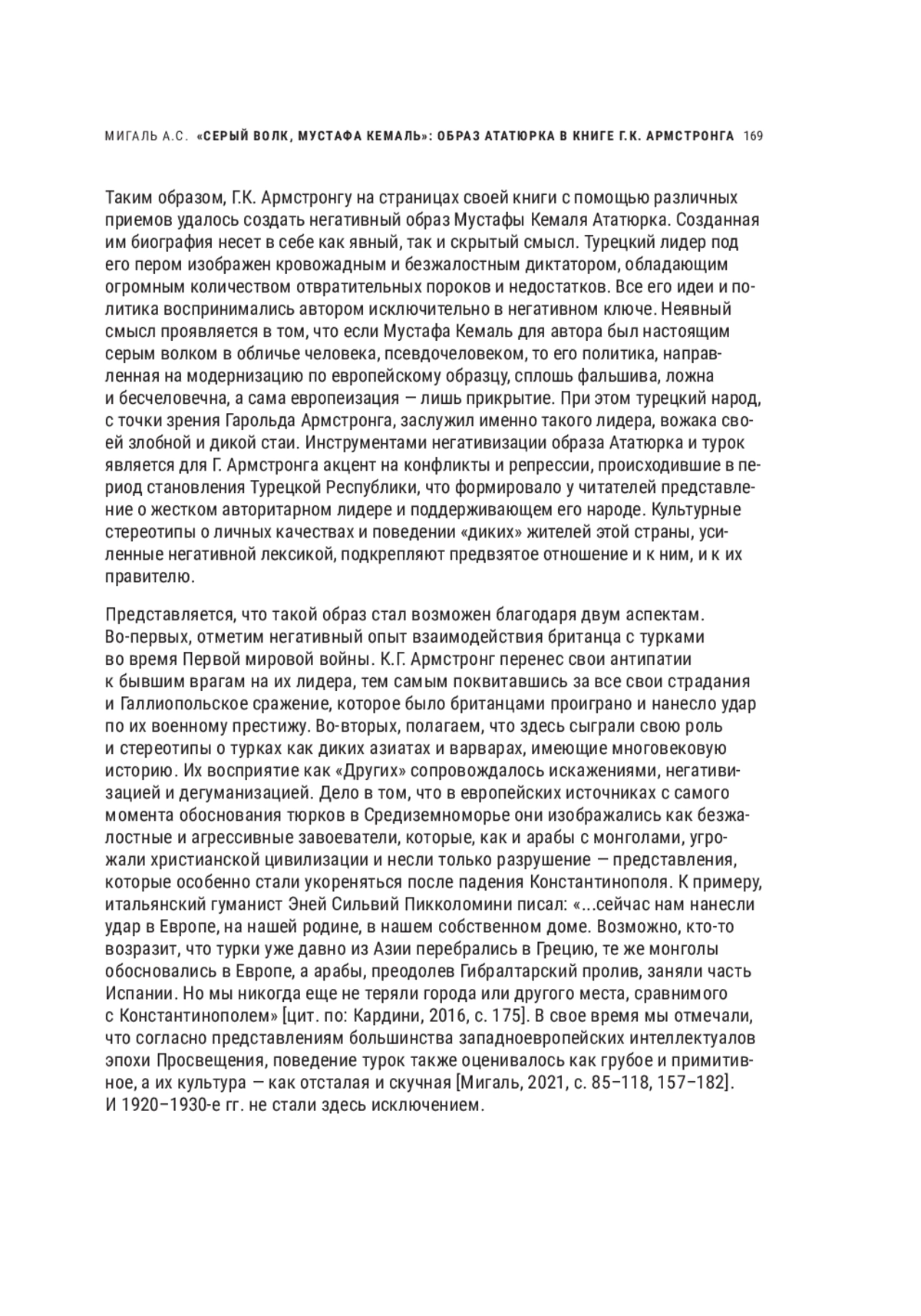 Представления о лидерах государств, складывающиеся за пределами их границ, являются важной составляющей образа страны в целом и ее культуры. Первый президент Турецкой Республики Мустафа Кемаль Ататюрк в этом смысле не является исключением. А книга «Серый волк, Мустафа Кемаль» бывшего британского военного Г. К. Армстронга представляет собой одну из первых прижизненных биографий основателя Турецкой Республики. Портрет турецкого лидера, созданный британцем, позволяет выявить стереотипы, существовавшие в 20–30-е гг. XX в. в представлениях британских интеллектуалов, проследив их отношение как к стране, так и ее населению. Изучение другой его книги, «Турция в муках», представляющей, по сути, воспоминания о пребывании в Турции, во многом объясняет причины его негативного отношения ко всему турецкому. Думается, что лишения во время пленения и пребывания в стамбульской тюрьме, смерть и страдания его сослуживцев во многом стали побудительным мотивом, послужившим прочной основой для создания книги об Ататюрке. Дискурс-анализ и семантический анализ текста «Серого волка» позволили проследить, как европейское восприятие турок и тюрок как «серых волков» соотносится с их стереотипным образом кочевников — обитателей азиатских степей. В книге Г. К. Армстронга Мустафа Кемаль предстает не как национальный лидер и «отец народа», а как кровожадный вожак стаи волков, причем такие качества «звериного характера», как стремление подчинять и подавлять других, жестокость и хитрость формировались с самых ранних лет жизни и достигли апогея в период его нахождения у власти