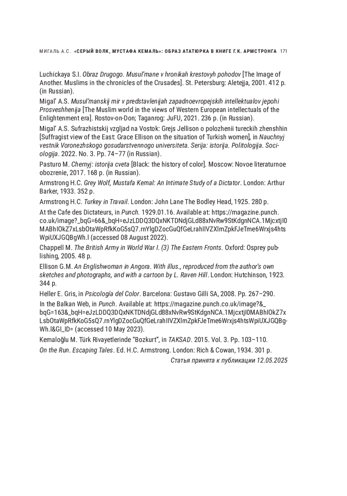 5. Мигаль А.С. Суфражистский взгляд на Восток: Грейс Эллисон о положении турецких женщин // Научный вестник Воронежского государственного университета. Серия: история. Политология. Социология. 2022. № 3. С. 74-77.