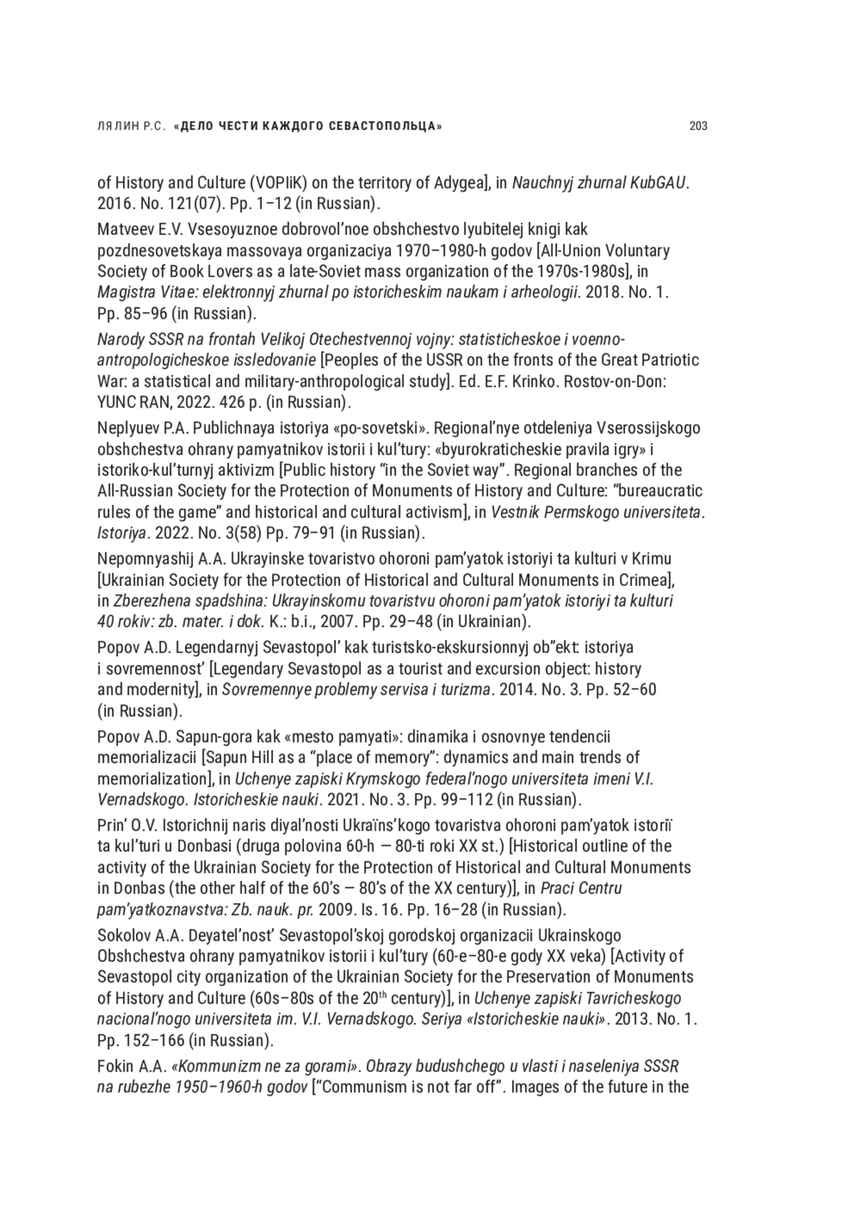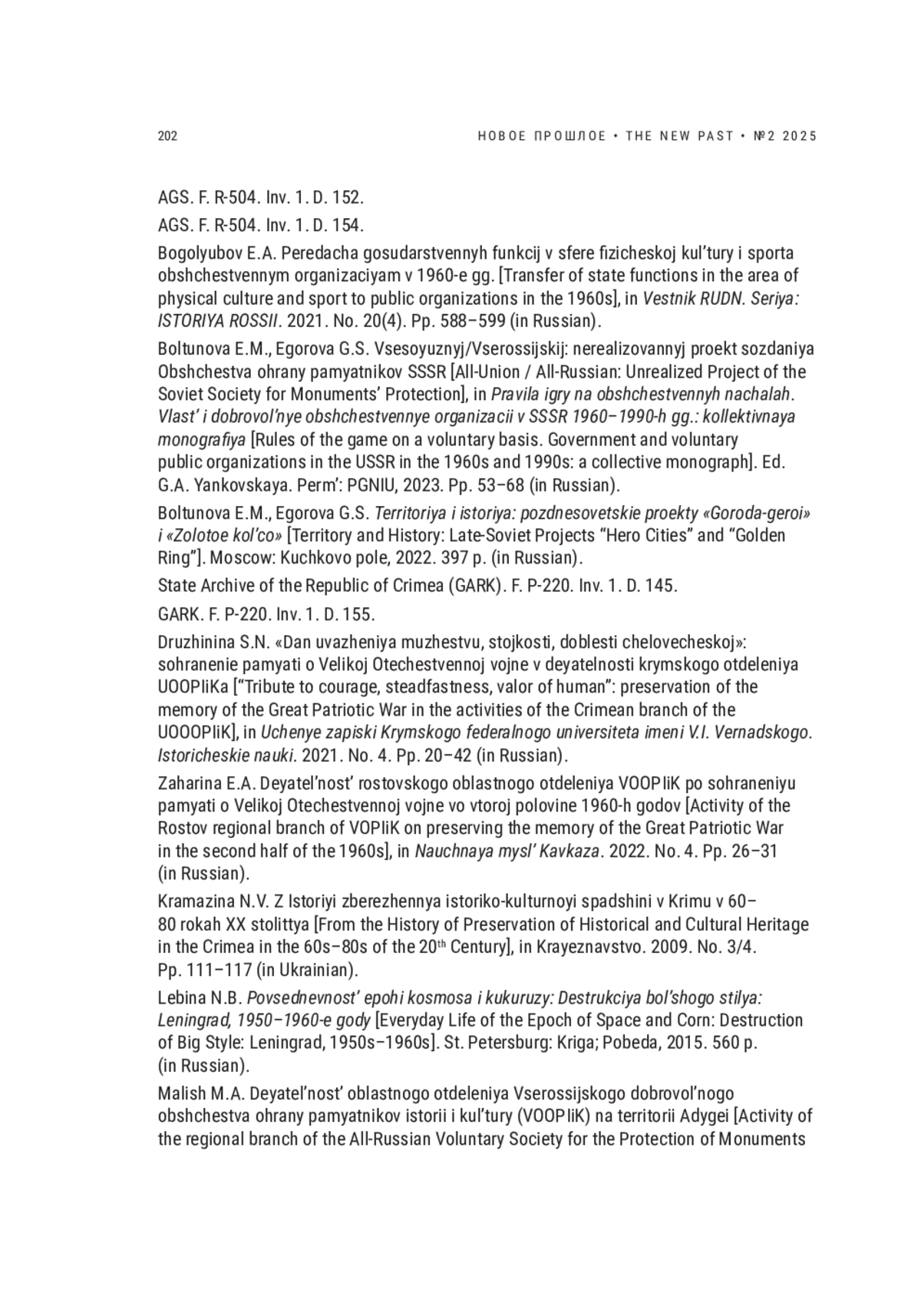 86. Druzhinina S.N. “Dan uvazheniya muzhestvu, stojkosti, doblesti chelovecheskoj”: sohranenie pamyati o Velikoj Otechestvennoj vojne v deyatelnosti krymskogo otdeleniya UOOPIiKa [“Tribute to courage, steadfastness, valor of human”: preservation of the memory of the Great Patriotic War in the activities of the Crimean branch of the UOOOPIiK], in Uchenye zapiski Krymskogo federalnogo universiteta imeni V.I. Vernadskogo. Istoricheskie nauki. 2021. No. 4. Pp. 20-42 (in Russian).