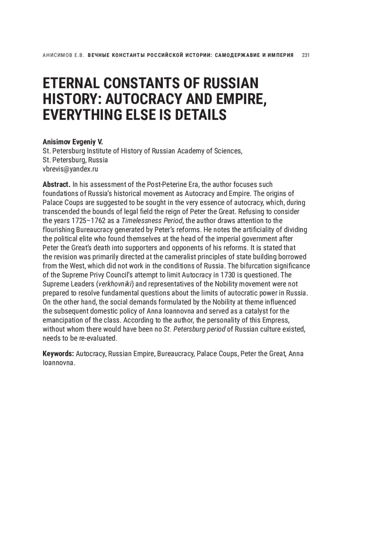 23. Anisimov E.V. Samoderzhavie XVIII veka: pravo pravit’ bez prava [Autocracy of the 18th Century: the Right to Rule Without Law], in Nestor. 2005b. No. 1 (7). Рр. 200-207 (in Russian).