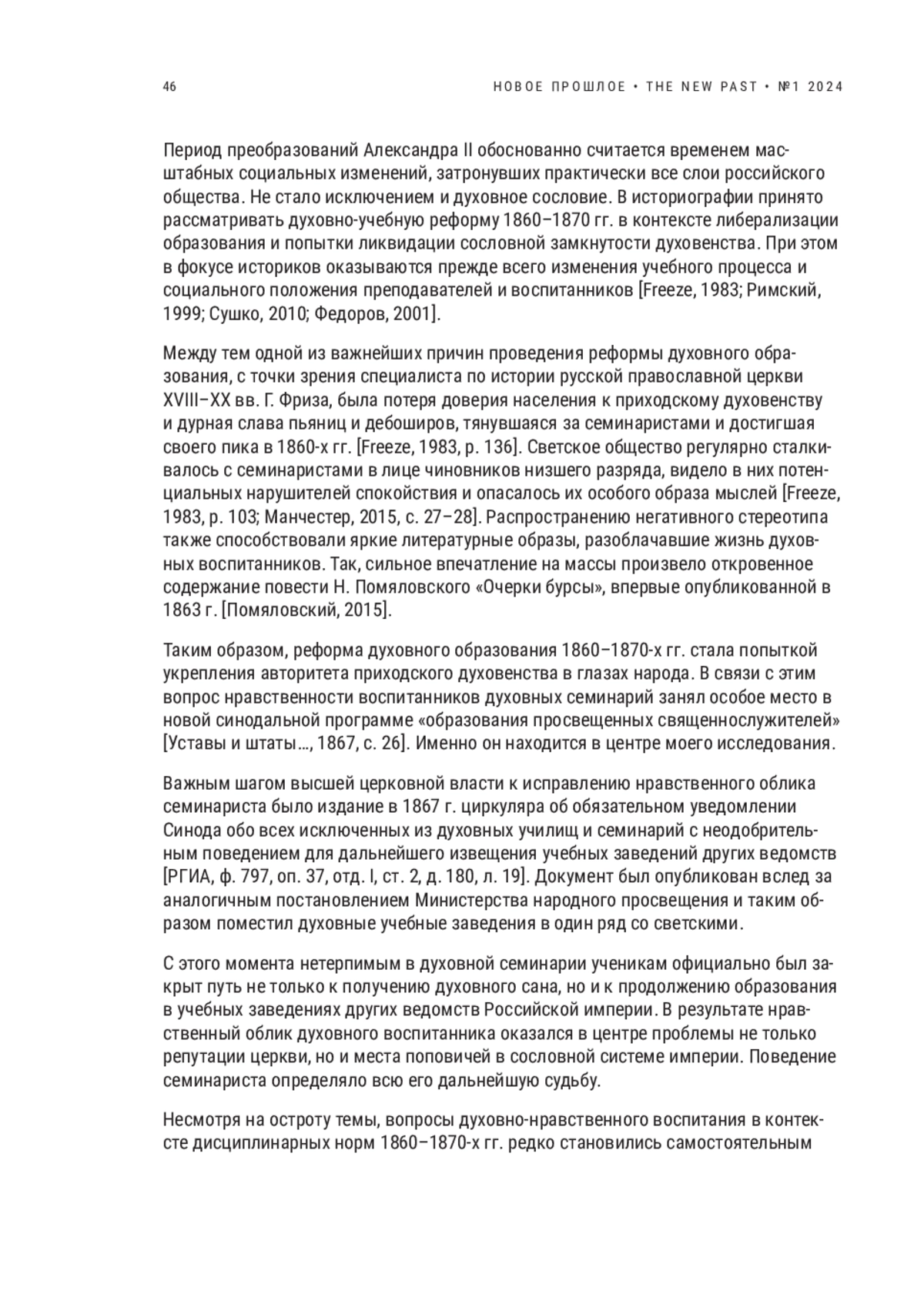 Период преобразований Александра II обоснованно считается временем масштабных социальных изменений, затронувших практически все слои российского общества. Не стало исключением и духовное сословие. В историографии принято рассматривать духовно-учебную реформу 1860–1870 гг. в контексте либерализации образования и попытки ликвидации сословной замкнутости духовенства. При этом в фокусе историков оказываются прежде всего изменения учебного процесса и социального положения преподавателей и воспитанников [Freeze, 1983; Римский, 1999; Сушко, 2010; Федоров, 2001].