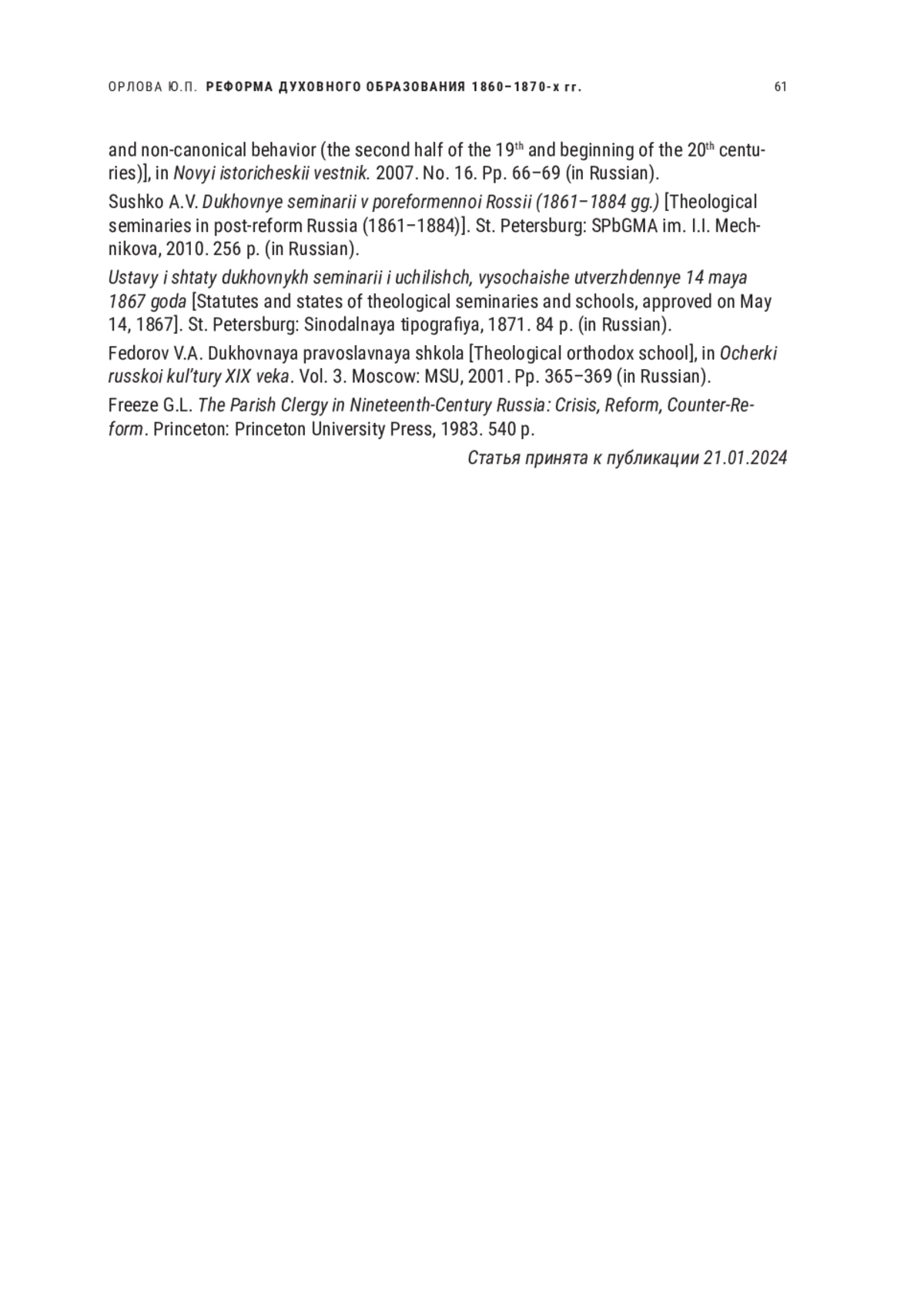 25. Freeze G.L. The Parish Clergy in Nineteenth-Century Russia: Crisis, Reform, Counter-Reform. Princeton: University Press, 1983. 540 p.