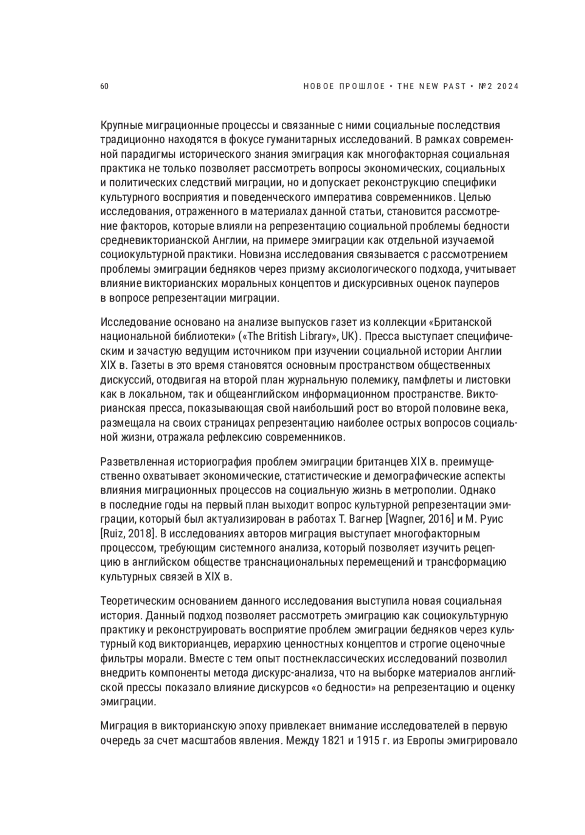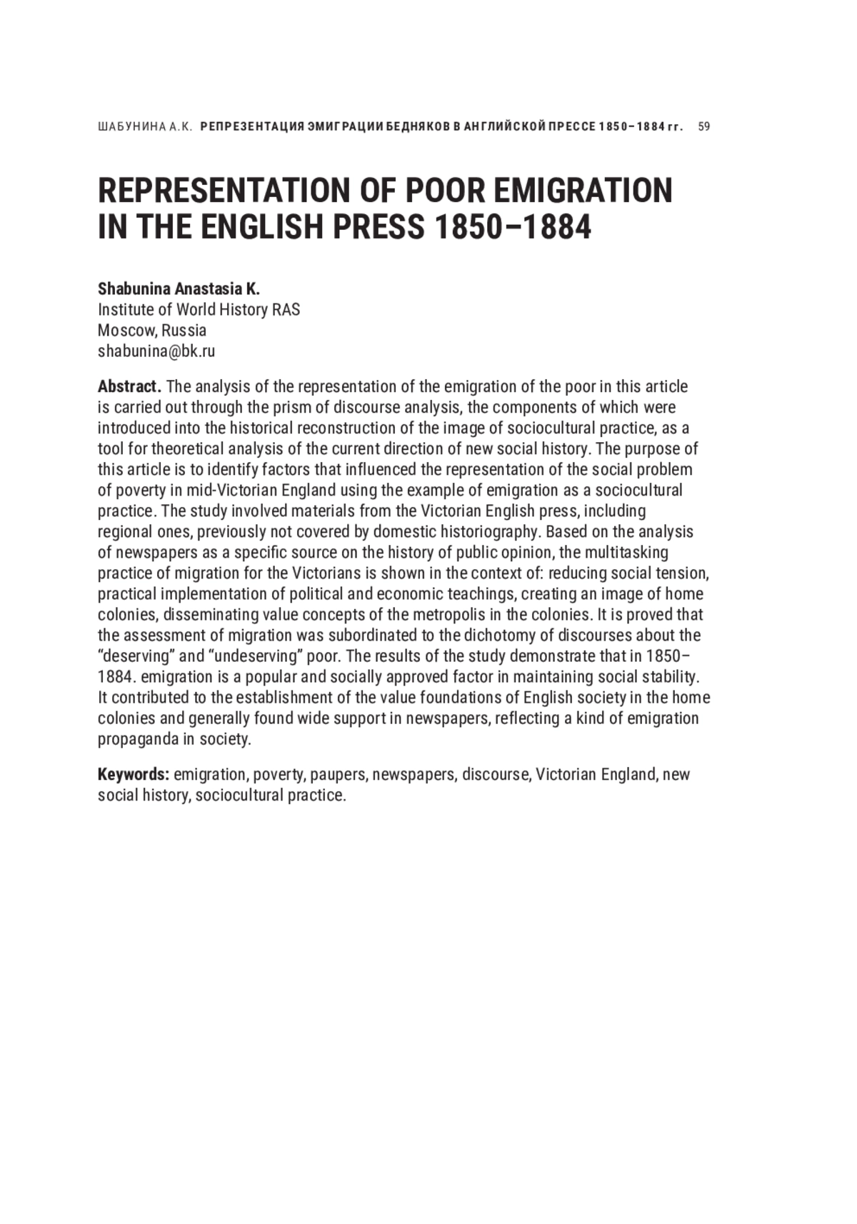 Статья: РЕПРЕЗЕНТАЦИЯ ЭМИГРАЦИИ БЕДНЯКОВ В АНГЛИЙСКОЙ ПРЕССЕ 1850-1884 ГГ (2024)