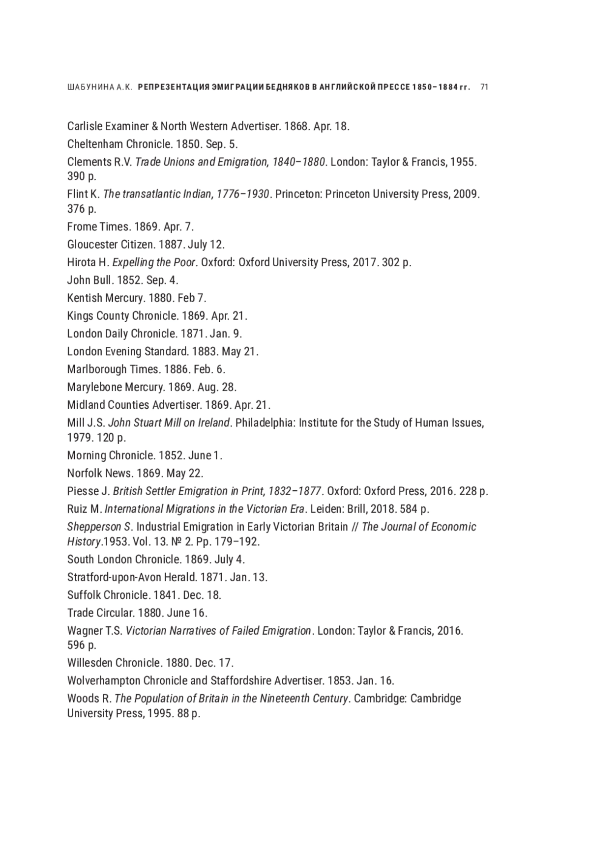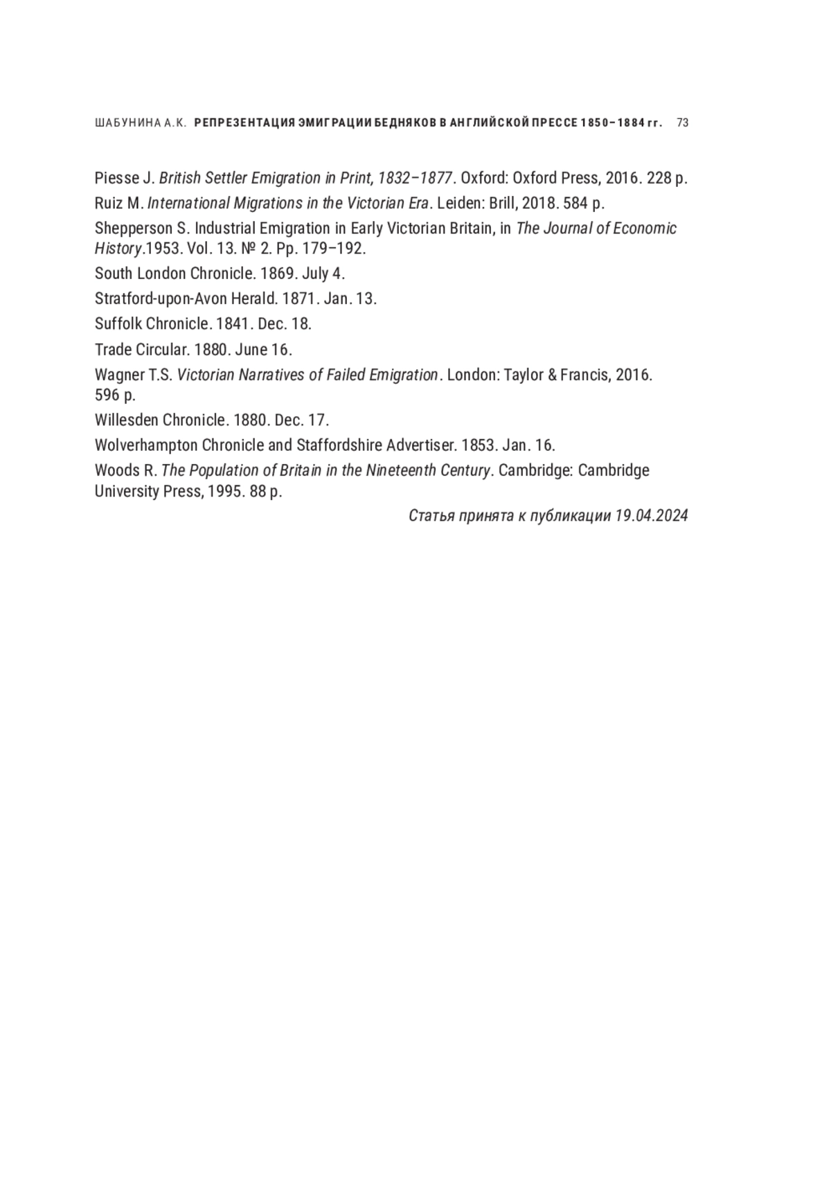 ШАБУНИНА А. К. РЕПРЕЗЕНТАЦИЯ ЭМИГРАЦИИ БЕДНЯКОВ В АНГЛИЙСКОЙ ПРЕССЕ 1850-1884 ГГ // НОВОЕ ПРОШЛОЕ. 2024. № 2