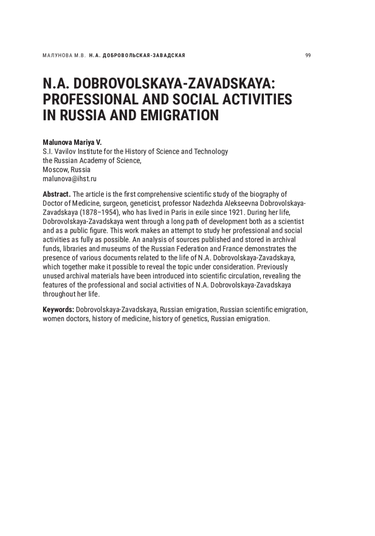 Статья является первым комплексным научным исследованием биографии доктора медицины, хирурга, генетика, профессора Надежды Алексеевны Добровольской-Завадской (1878–1954), с 1921 г. проживавшей в Париже в эмиграции. Добровольская-Завадская за свою жизнь прошла длительный путь развития и как ученый, и как общественный деятель. В данной работе сделана попытка с максимальной полнотой изучить ее профессиональную и общественную деятельность. Анализ источников, опубликованных и хранящихся в архивных фондах, библиотеках и музеях Российской Федерации и Франции, демонстрирует наличие разных документов, связанных с жизнью Н. А. Добровольской-Завадской, в комплексе позволяющих раскрыть рассматриваемую тему. В научный оборот введены не использовавшиеся ранее архивные материалы, раскрывающие особенности профессиональной и общественной деятельности Н. А. Добровольской-Завадской в течение всей жизни