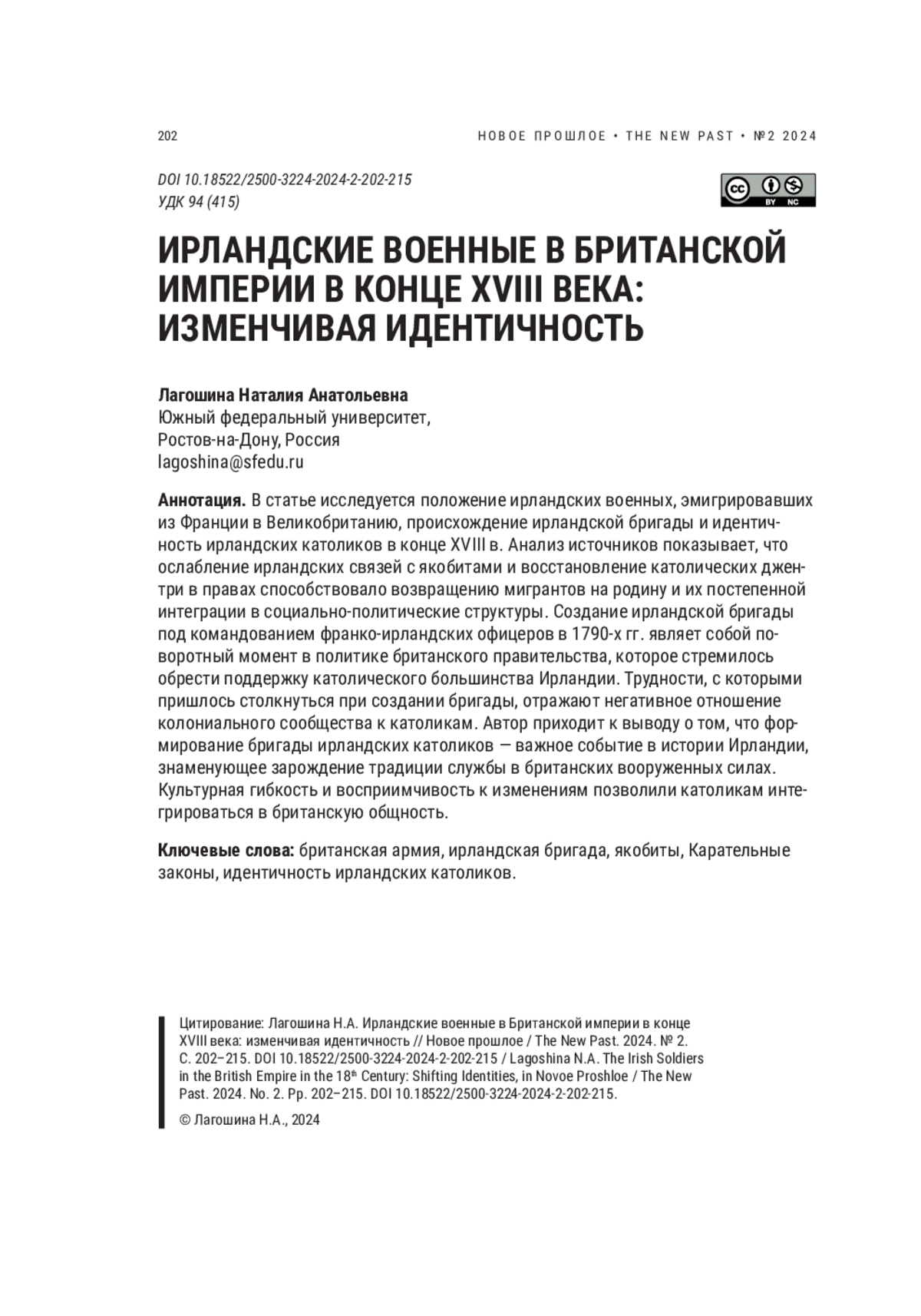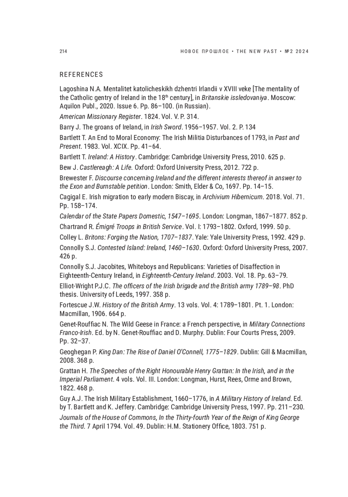 1. Лагошина Н.А. Менталитет католических джентри Ирландии в XVIII веке // Британские исследования. Выпуск 6. М.: Аквилон, 2020. С. 86-100. EDN: XONMZV