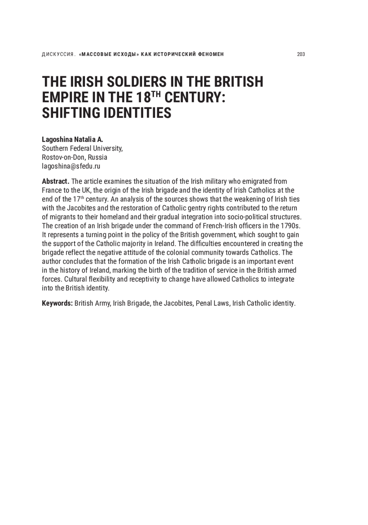 В статье исследуется положение ирландских военных, эмигрировавших из Франции в Великобританию, происхождение ирландской бригады и идентичность ирландских католиков в конце XVIII в. Анализ источников показывает, что ослабление ирландских связей с якобитами и восстановление католических джентри в правах способствовало возвращению мигрантов на родину и их постепенной интеграции в социально-политические структуры. Создание ирландской бригады под командованием франко-ирландских офицеров в 1790-х гг. являет собой поворотный момент в политике британского правительства, которое стремилось обрести поддержку католического большинства Ирландии. Трудности, с которыми пришлось столкнуться при создании бригады, отражают негативное отношение колониального сообщества к католикам. Автор приходит к выводу о том, что формирование бригады ирландских католиков — важное событие в истории Ирландии, знаменующее зарождение традиции службы в британских вооруженных силах. Культурная гибкость и восприимчивость к изменениям позволили католикам интегрироваться в британскую общность