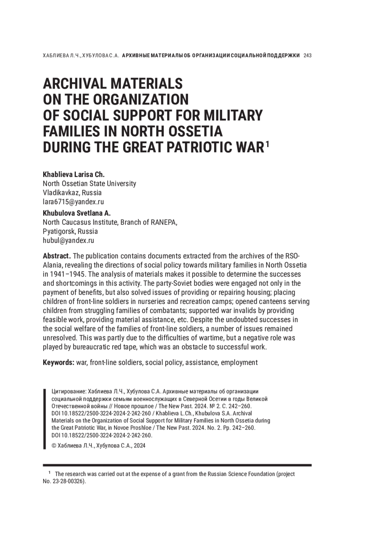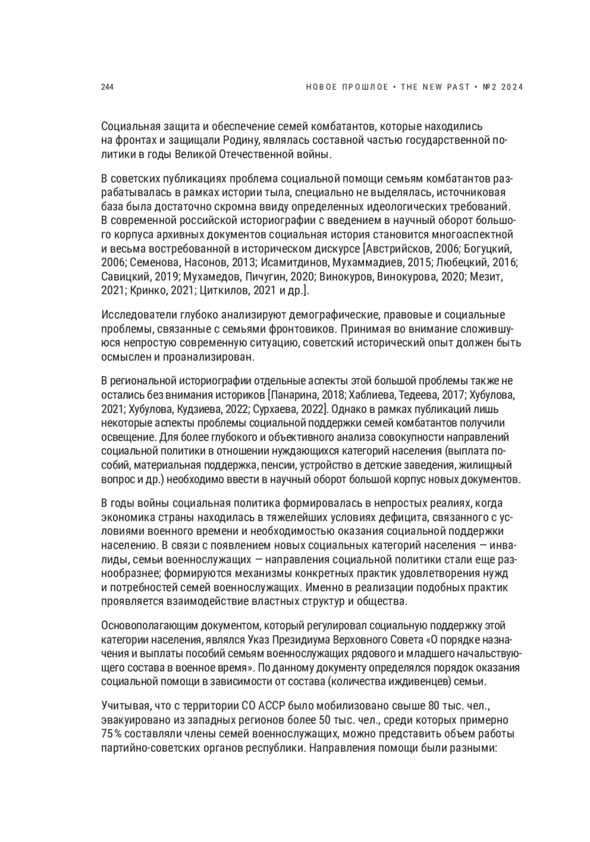 ХАБЛИЕВА Л. Ч., ХУБУЛОВА С. А. АРХИВНЫЕ МАТЕРИАЛЫ ОБ ОРГАНИЗАЦИИ СОЦИАЛЬНОЙ ПОДДЕРЖКИ СЕМЬЯМ ВОЕННОСЛУЖАЩИХ В СЕВЕРНОЙ ОСЕТИИ В ГОДЫ ВЕЛИКОЙ ОТЕЧЕСТВЕННОЙ ВОЙНЫ // НОВОЕ ПРОШЛОЕ. 2024. № 2