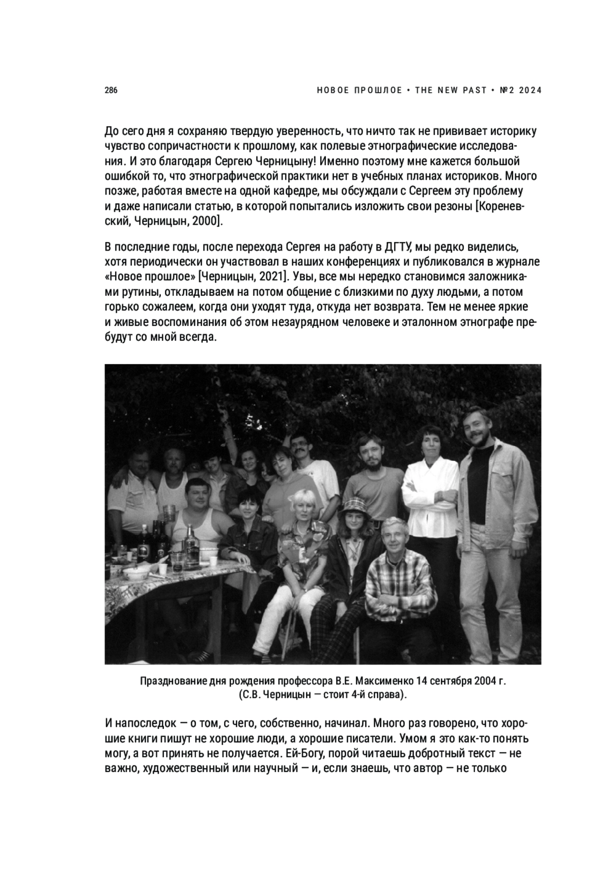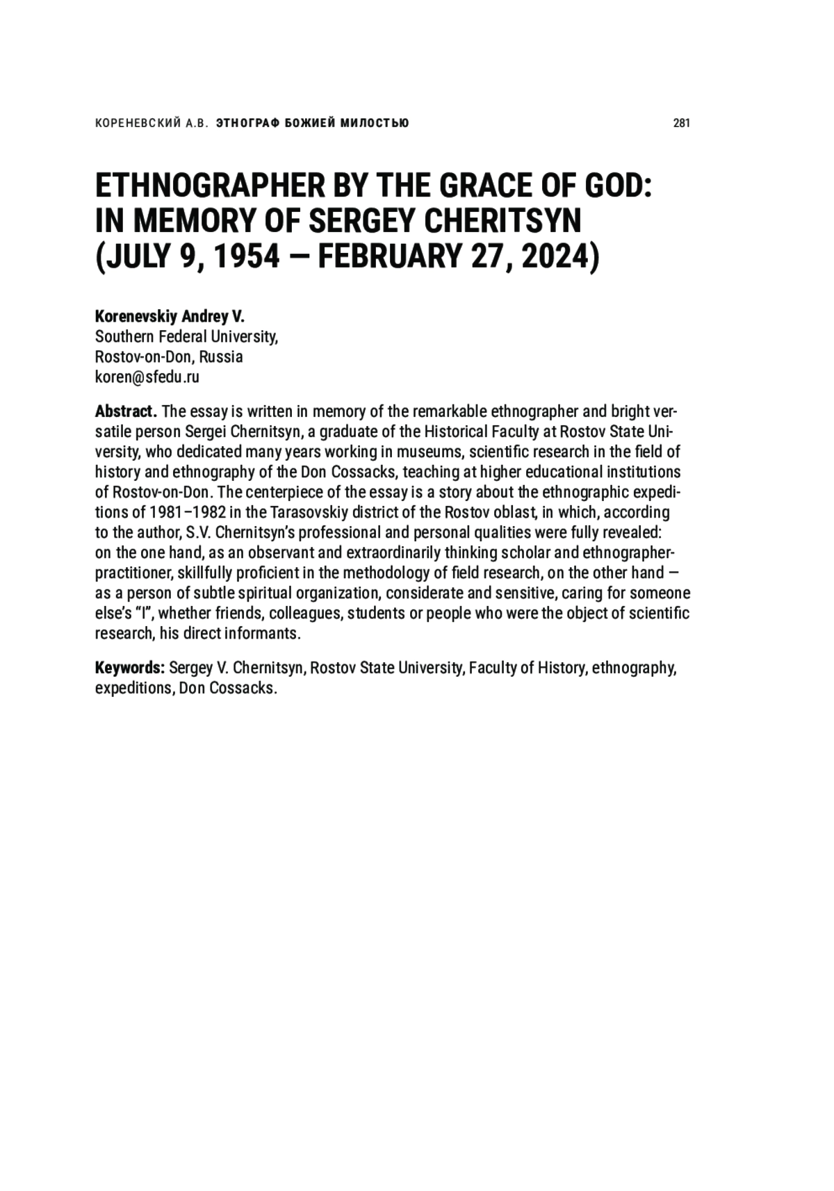 Очерк посвящен воспоминаниям о замечательном этнографе и яркой многогранной личности — Сергее Вячеславовиче Черницыне, выпускнике исторического факультета Ростовского государственного университета, многие годы отдавшего работе в музеях, научным исследованиям в области истории и этнографии донского казачества, преподаванию в высших учебных заведениях Ростована-Дону. Центральное место в очерке занимает рассказ об этнографических экспедициях 1981–1982 гг. в Тарасовском районе Ростовской области, в которых, по мнению автора, полностью раскрылись профессиональные и личные качества С. В. Черницына: с одной стороны — как наблюдательного и неординарно мыслящего ученого и этнографа-практика, искусно владеющего методикой полевых исследований, с другой — как человека тонкой душевной организации, тактичного и чуткого, бережно относящегося к чужому «Я», будь то друзья, коллеги, студенты или люди, являющиеся объектом научных изысканий, его непосредственными информаторами.
