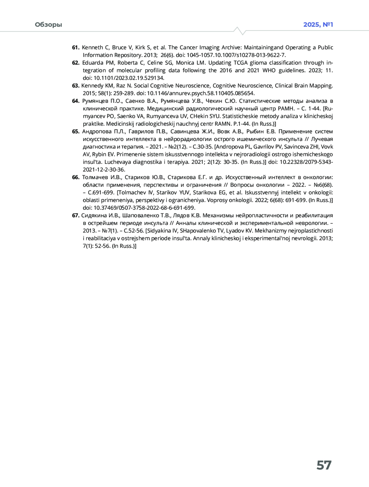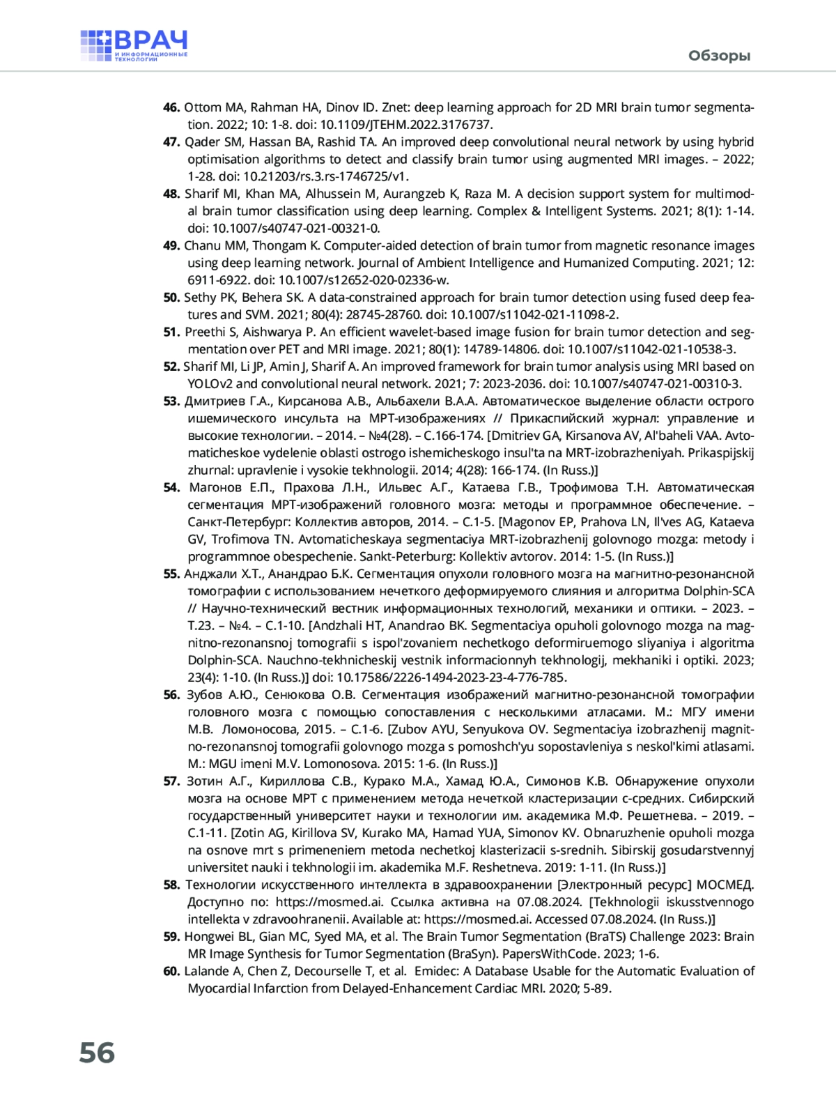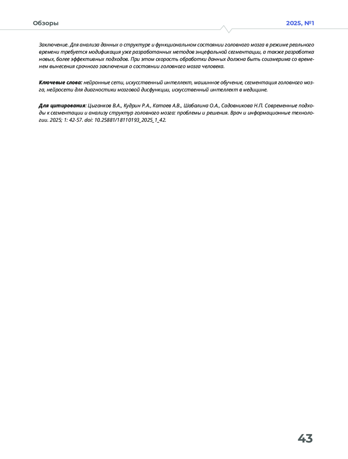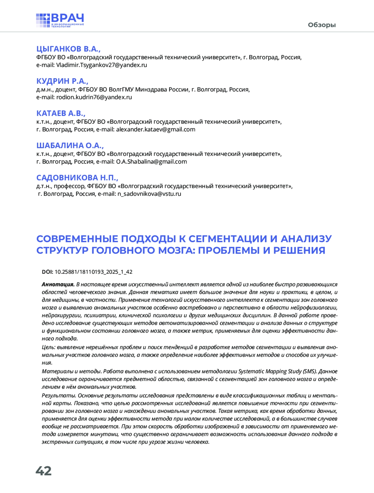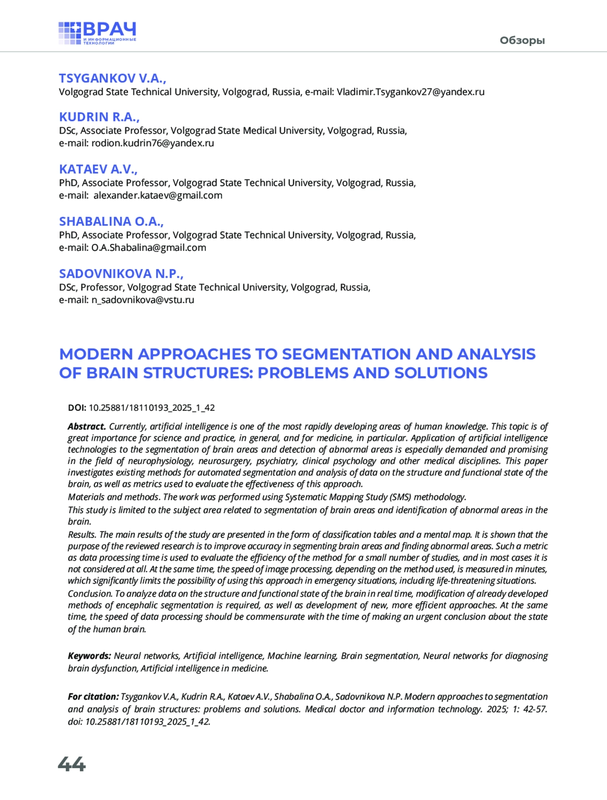 ЦЫГАНКОВ В. А., КУДРИН Р. А., КАТАЕВ А. В., ШАБАЛИНА О. А., САДОВНИКОВА Н. П. СОВРЕМЕННЫЕ ПОДХОДЫ К СЕГМЕНТАЦИИ И АНАЛИЗУ СТРУКТУР ГОЛОВНОГО МОЗГА: ПРОБЛЕМЫ И РЕШЕНИЯ // ВРАЧ И ИНФОРМАЦИОННЫЕ ТЕХНОЛОГИИ. 2025. № 1