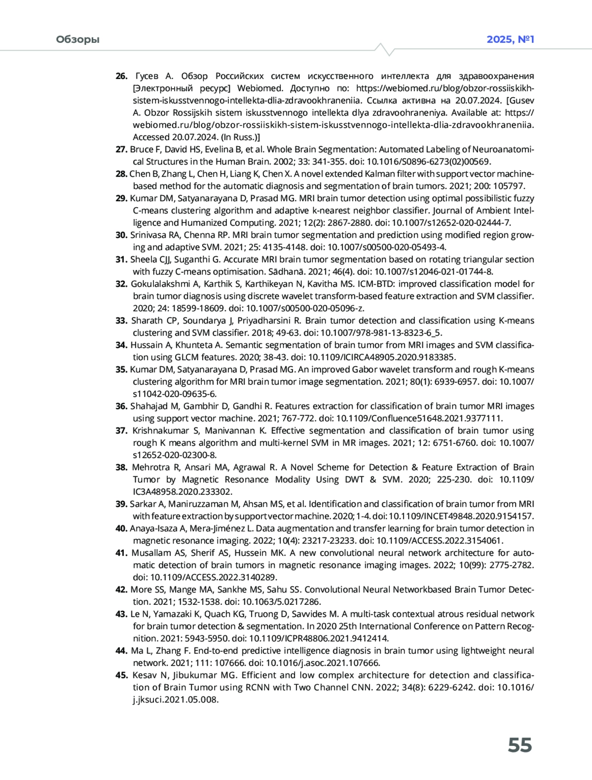 Ключевые фразы: нейронные сети, искусственный интеллект, машинное обучение, сегментация головного моз- га, нейросети для диагностики мозговой дисфункции, искусственный интеллект в медицине