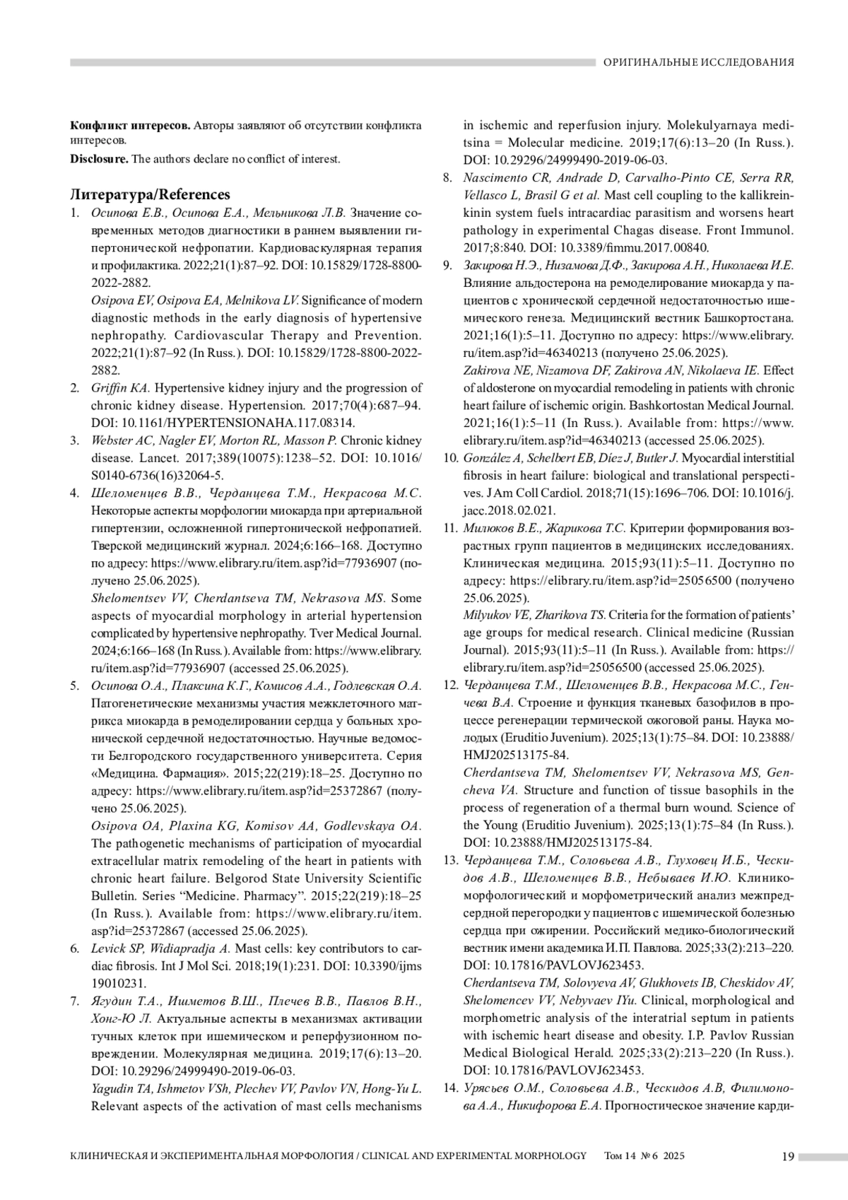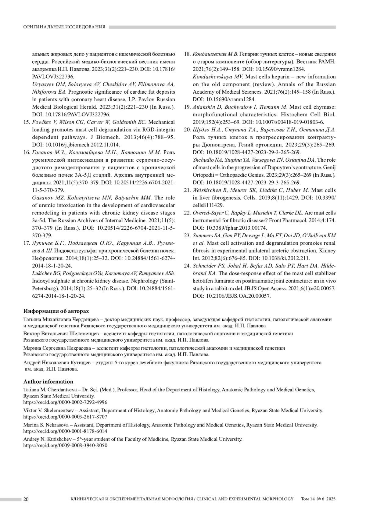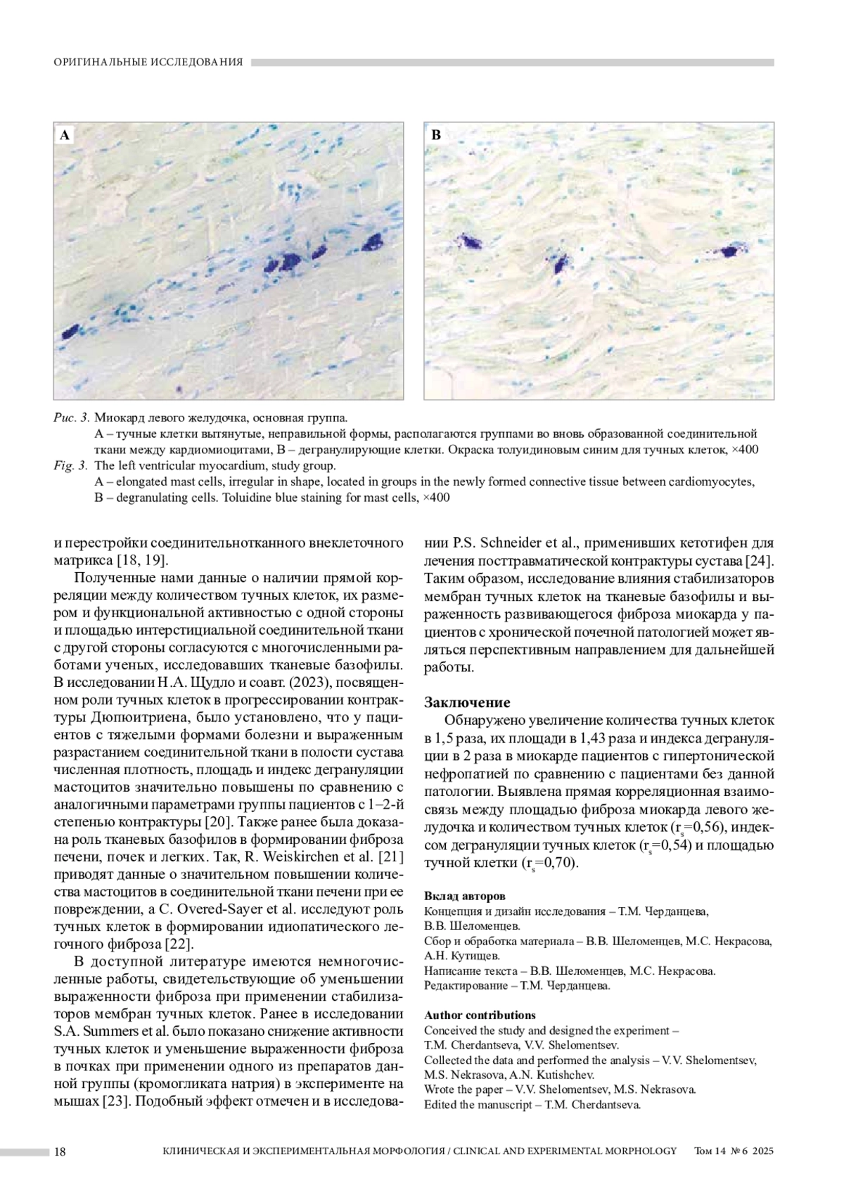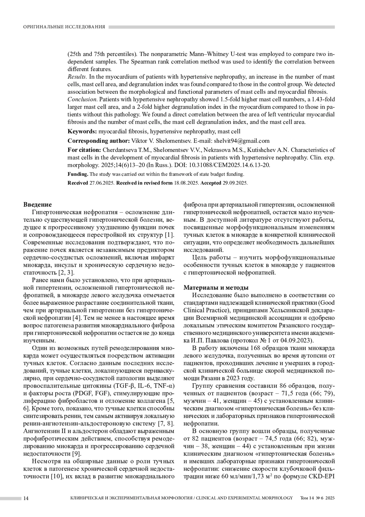 ЧЕРДАНЦЕВА Т. М., ШЕЛОМЕНЦЕВ В. В., НЕКРАСОВА М. С., КУТИЩЕВ А. Н. ХАРАКТЕРИСТИКА ТУЧНЫХ КЛЕТОК В РАЗВИТИИ ФИБРОЗА МИОКАРДА У ПАЦИЕНТОВ С ГИПЕРТОНИЧЕСКОЙ НЕФРОПАТИЕЙ // КЛИНИЧЕСКАЯ И ЭКСПЕРИМЕНТАЛЬНАЯ МОРФОЛОГИЯ. 2025. № 6, ТОМ 14