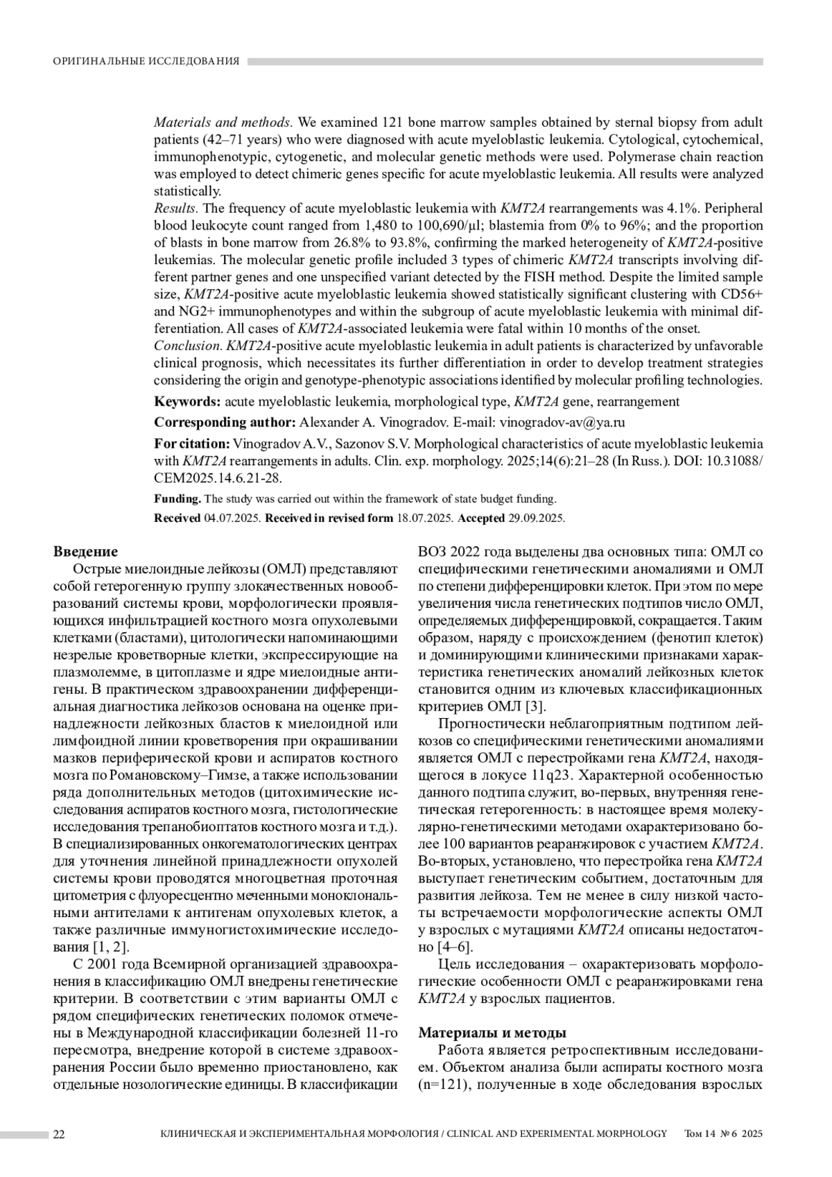 Заключение. Таким образом, KMT2A+ острые миелоидные лейкозы у взрослых характеризуются неблагоприятным клиническим прогнозом, что обусловливает необходимость их дальнейшей дифференциации для разработки лечебных стратегий, учитывающих клеточное происхождение и генотип-фенотипические ассоциации на основе технологий молекулярного профилирования.