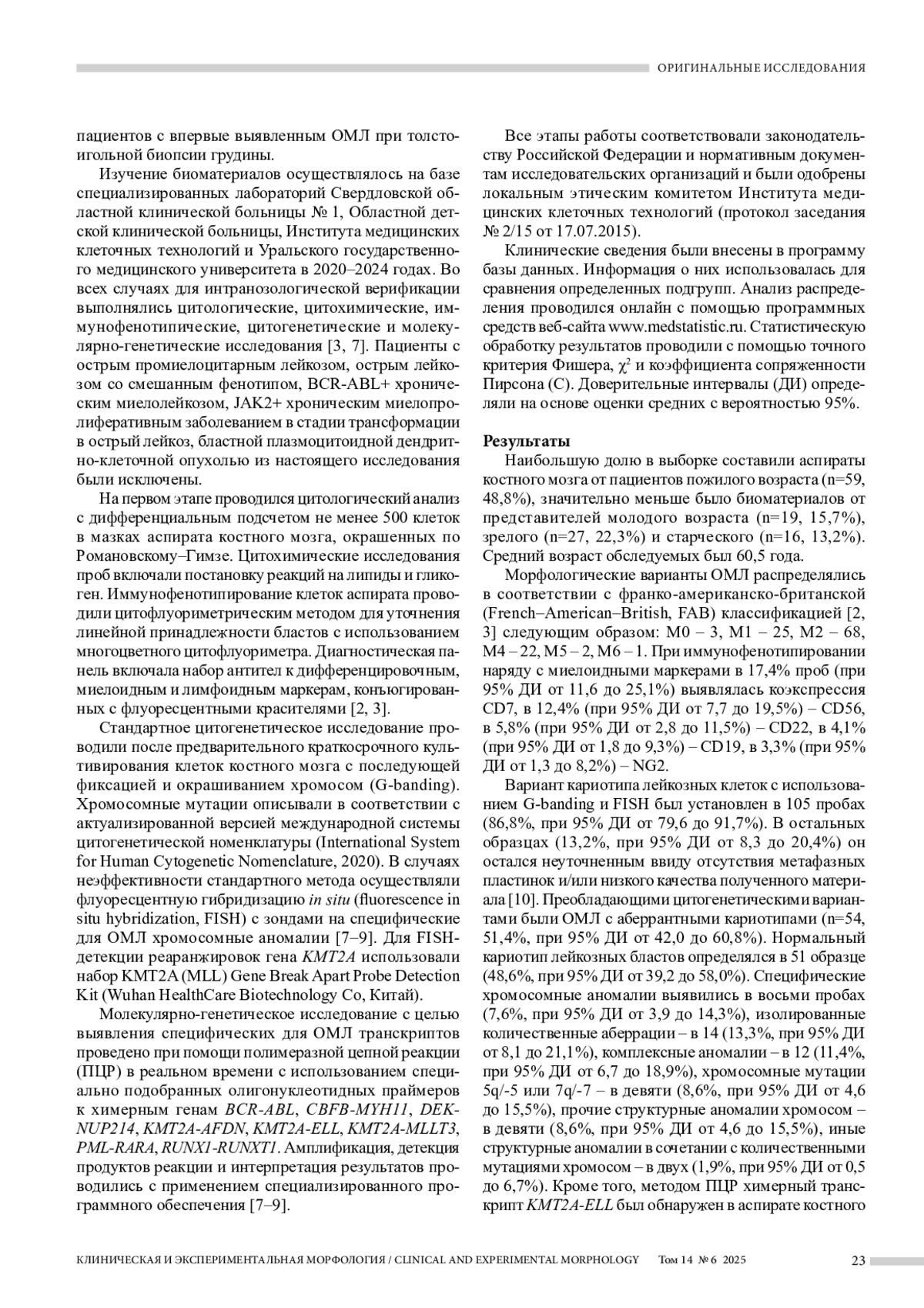 Результаты. Частота острых миелоидных лейкозов с реаранжировками KMT2A в исследуемой группе равнялась 4,1%. Возраст пациентов составлял от 42 до 71 года, уровень лейкоцитов в периферической крови – от 1480 до 100 690 в 1 мкл, бластемия – от 0 до 96%, уровень бластов в костном мозге – от 26,8 до 93,8%, что подтверждает значительную гетерогенность KMT2A+ лейкозов. Молекулярно-генетические варианты мутаций включали три типа химерных транскриптов KMT2A с разными генами-партнерами и один неспецифицированный вариант. Несмотря на ограниченный объем выборки, была выявлена статистически достоверная кластеризация KMT2A+ острых миелоидных лейкозов с иммунофенотипом CD56+, NG2+, а также в подгруппе с минимальной дифференцировкой. Во всех случаях течение KMT2A-ассоциированных лейкозов завершилось летальным исходом в сроки, не превышающие 10 месяцев от начала заболевания.