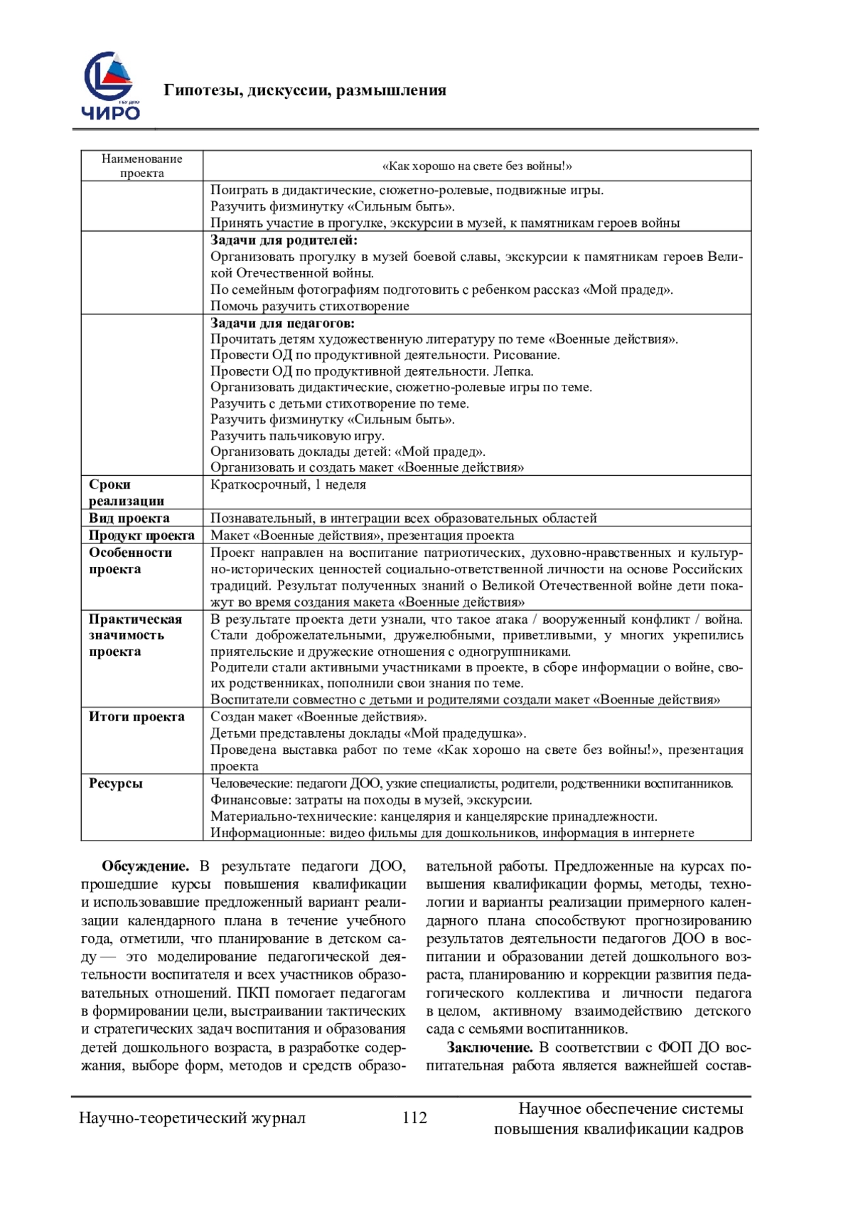Проблема исследования и обоснование ее актуальности. Исследование показало, что значительное количество педагогических работников обладают недостаточным уровнем готовности к использованию новых форм, методов, технологий в своей практике и хотели бы приобрести профессиональные умения. Противоречие заключается в том, что, с одной стороны, существует необходимость формирования разностороннего развития ребенка дошкольного возраста на основе духовно-нравственных ценностей российского народа, а с другой, не все педагоги обладают достаточной готовностью и компетенциями для эффективного осуществления этого процесса. Цель исследования: формирование умений педагогов ДОО использовать в своей работе новые формы и методы, отвечающие потребностям современной дошкольной педагогики, планировать образовательный и воспитательный процесс. Методология (материалы и методы). Анализ результатов опроса педагогических работников говорит о том, что максимальные затруднения педагоги общеобразовательных организаций испытывают при реализации умений: моделирование методов, приемов и инструментов для достижения образовательных результатов детьми дошкольного возраста. В ходе исследования были использованы следующие методы: изучение и анализ нормативных документов, педагогической литературы, анкетирование, анализ результатов самообследования педагогов, статистические методы обработки данных. Научная новизна данного исследования заключается в разработке моделирования форм, методов и приемов для достижения образовательных результатов посредством реализации Примерного календарного плана воспитательной работы. Результаты. Анализ полученных результатов показал, что все педагоги, прошедшие обучение на курсах повышения квалификации в ТОИПКРО, используют современные формы, методы и приемы для достижения образовательных результатов посредством реализации Примерного календарного плана воспитательной работы. Воспитанники детских садов продемонстрировали на конец учебного года достаточно высокие показатели освоения программы воспитания, а также в ДОО активно используется алгоритм проектирования. Результаты достижений были представлены на семинарах, конференциях и форумах, организованных институтом.