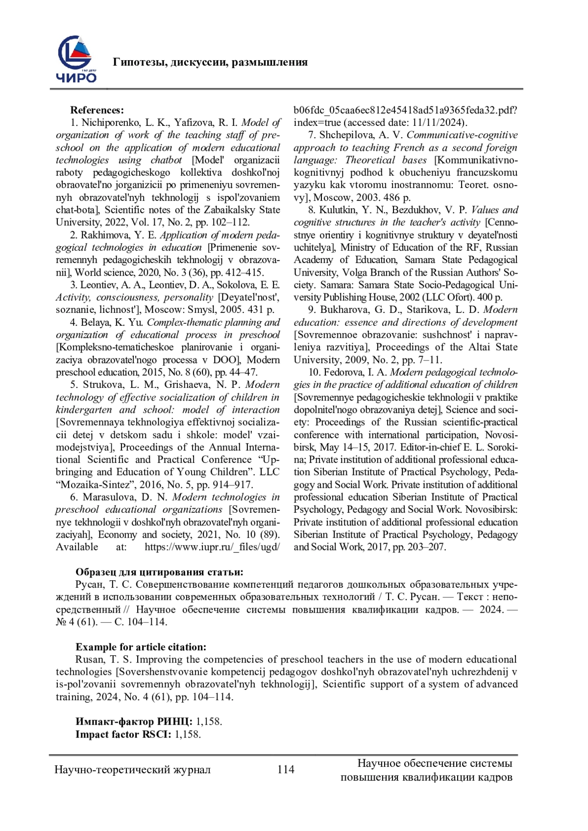 1. Ничипоренко, Л. К. Модель организации работы педагогического коллектива ДОО по применению современных образовательных технологий с использованием чат-бота / Л. К. Ничипоренко, Р. И. Яфизова. - Текст: непосредственный // Ученые записки Забайкальского государственного университета. - 2022. - Т. 17, № 2. - С. 102-112. EDN: RATWSE