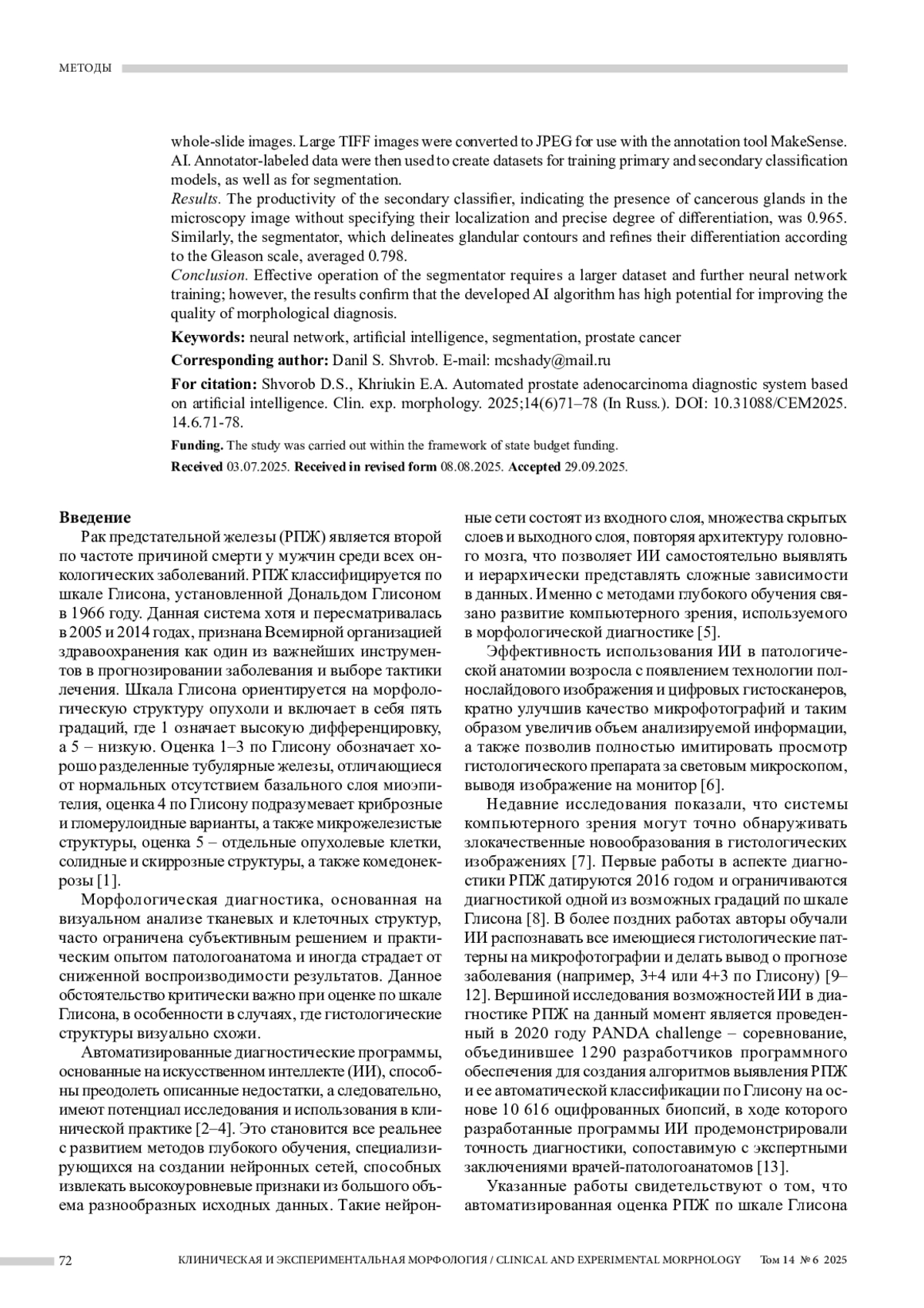 5. Волкова Л.В., Батищев А.В., Михалева Л.М. Исследование патологии желудка с использованием методов искусственного интеллекта для анализа данных микроскопии. Клиническая и экспериментальная морфология. 2024;13(3):5-15. DOI: 10.31088/CEM2024.13.3.5-15.