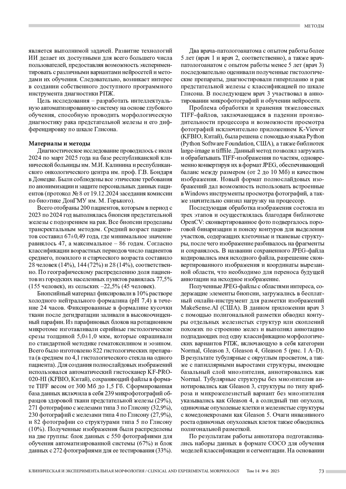 Материалы и методы. Материалом исследования послужили биоптаты предстательной железы 200 пациентов с подозрением на рак. 882 готовых гистологических препарата оцифровывались на автоматическом сканере с последующим созданием полнослайдовых изображений. Полученные тяжеловесные фотографии формата TIFF конвертировались в приемлемый для работы в аннотаторе формат JPEG. Аннотирование проводилось с помощью веб-инструмента MakeSense. AI. По результатам работы последнего подготавливались наборы данных для обучения моделей первичной и вторичной классификации, а также сегментации.