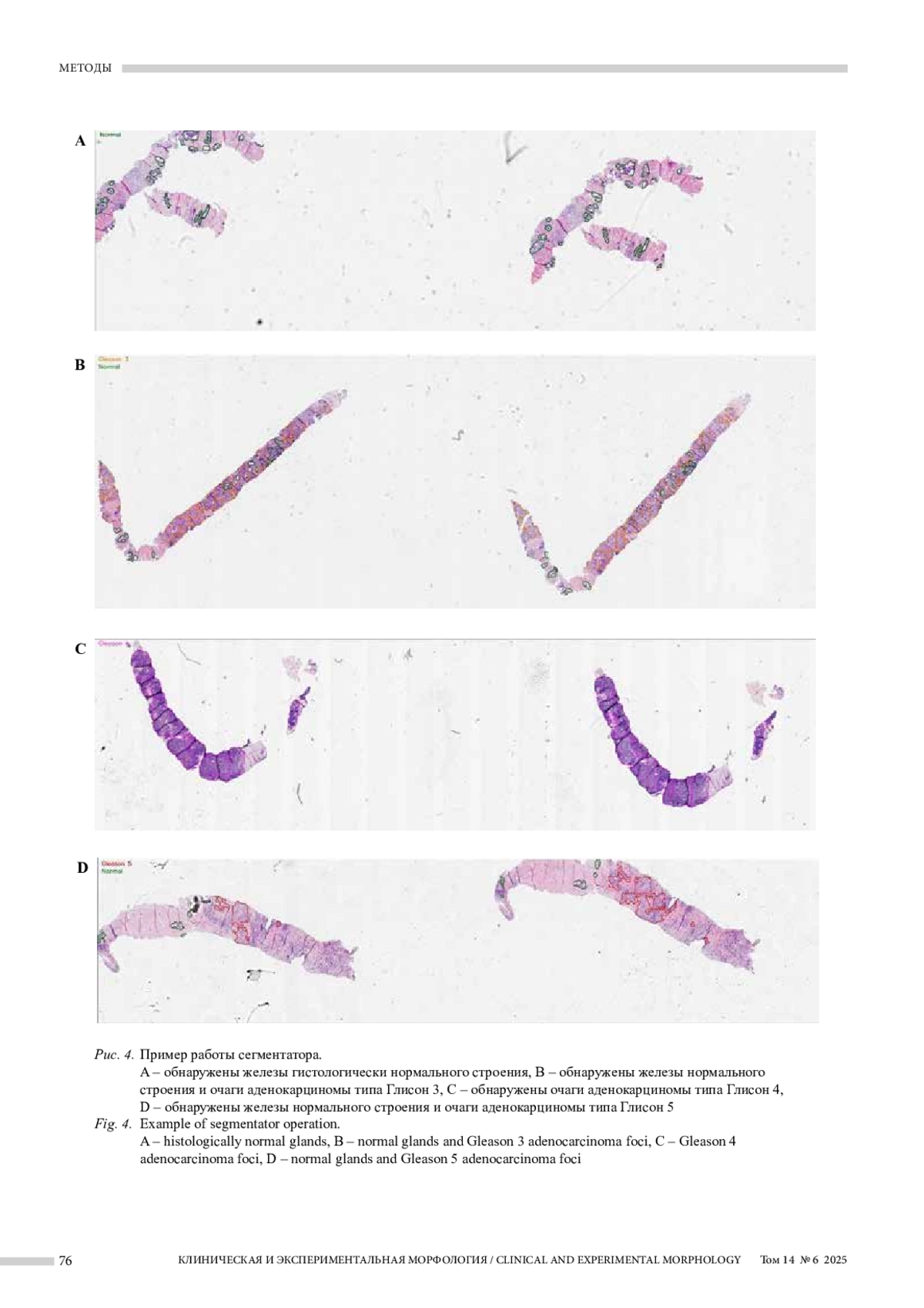 Введение. Предстательная железа – одна из самых частых локализаций у мужчин среди всех онкологических заболеваний. Гистологическая классификация рака предстательной железы основана на шкале Глисона и часто ограничена субъективным решением и практическим опытом врача-патологоанатома. Программы, основанные на искусственном интеллекте, способны преодолеть данный недостаток и имеют потенциал исследования и использования в клинической практике. Цель исследования – разработать интеллектуальную автоматизированную систему на основе глубокого обучения с целью морфологической диагностики рака предстательной железы с дифференциацией по шкале Глисона.