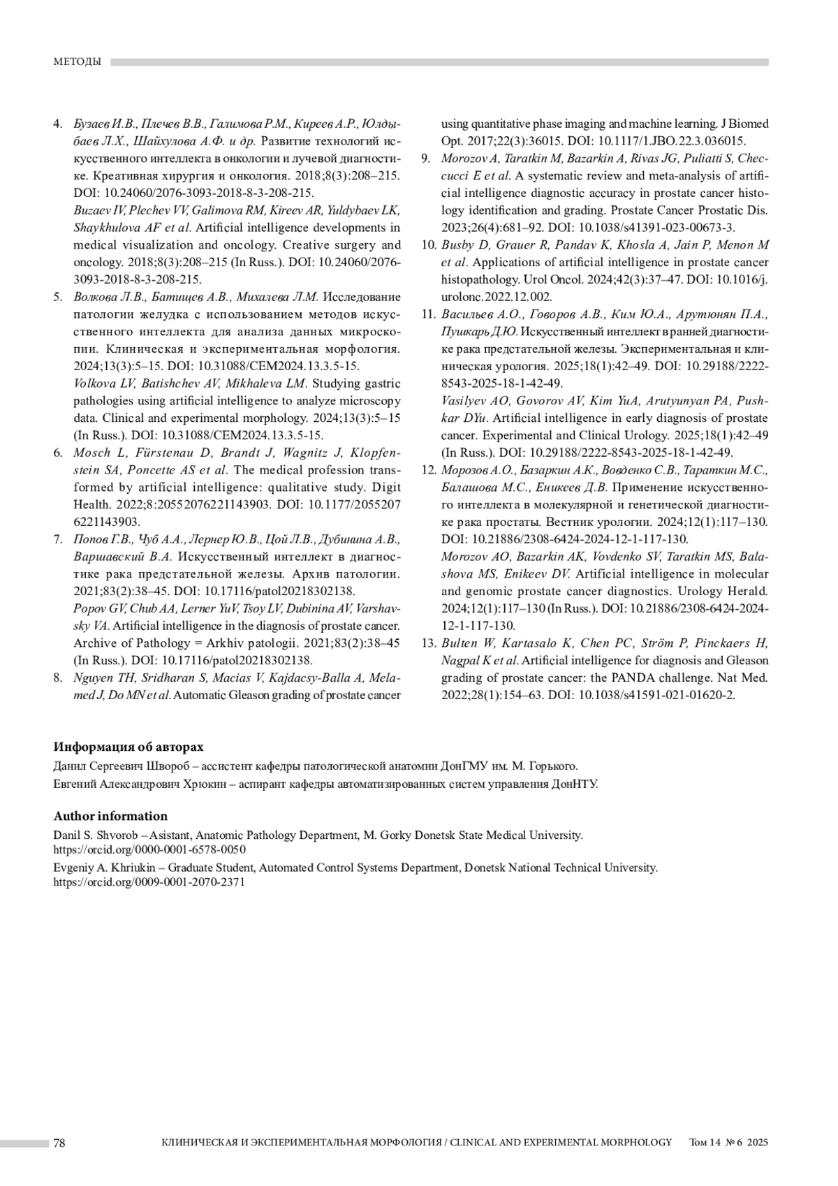 11. Васильев А.О., Говоров А.В., Ким Ю.А., Арутюнян П.А., Пушкарь Д.Ю. Искусственный интеллект в ранней диагностике рака предстательной железы. Экспериментальная и клиническая урология. 2025;18(1):42-49. DOI: 10.29188/22228543-2025-18-1-42-49.