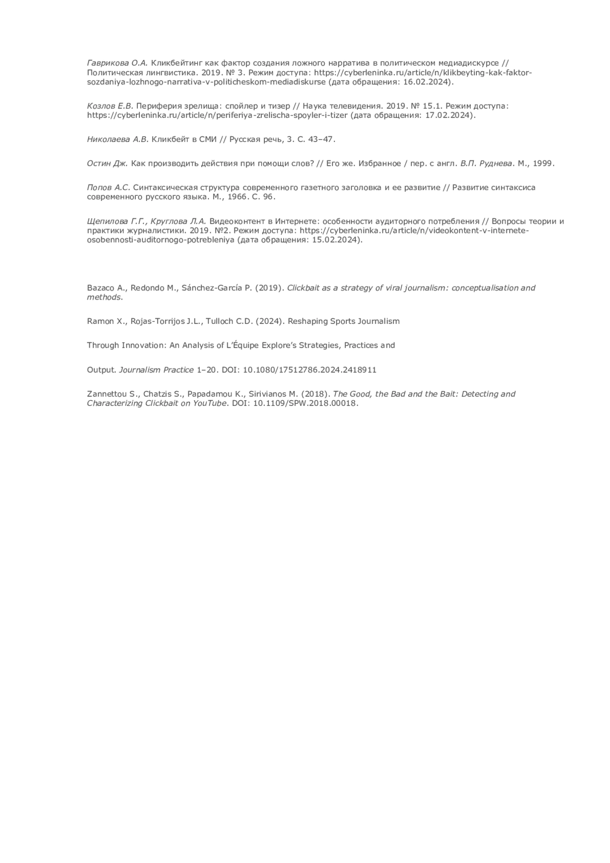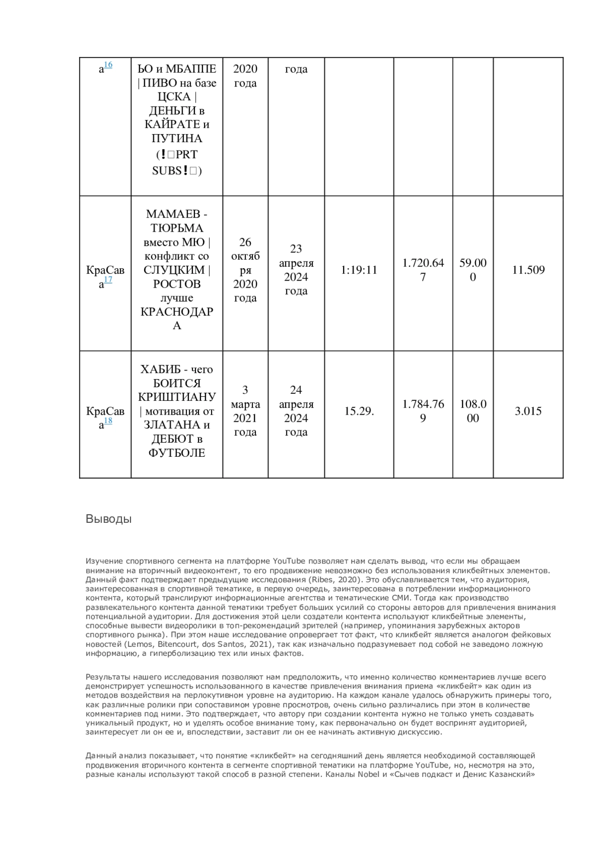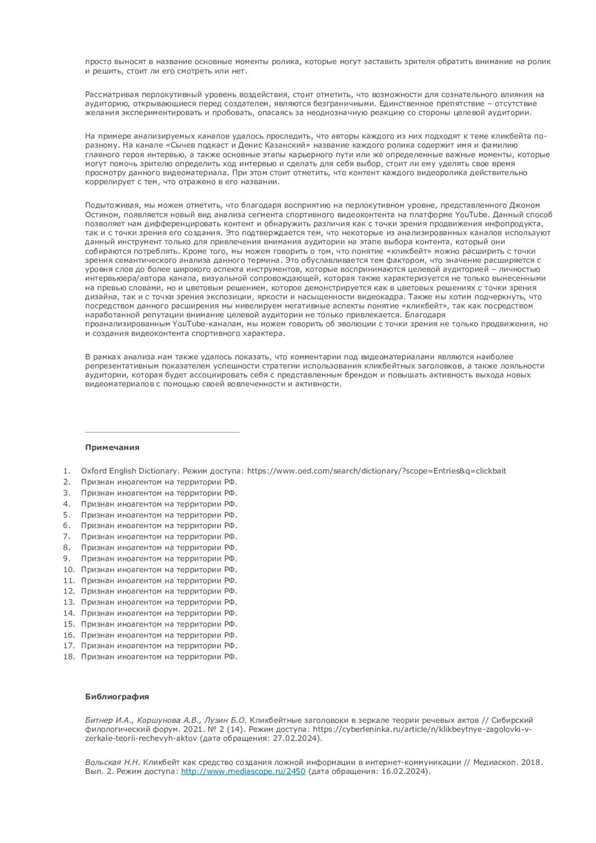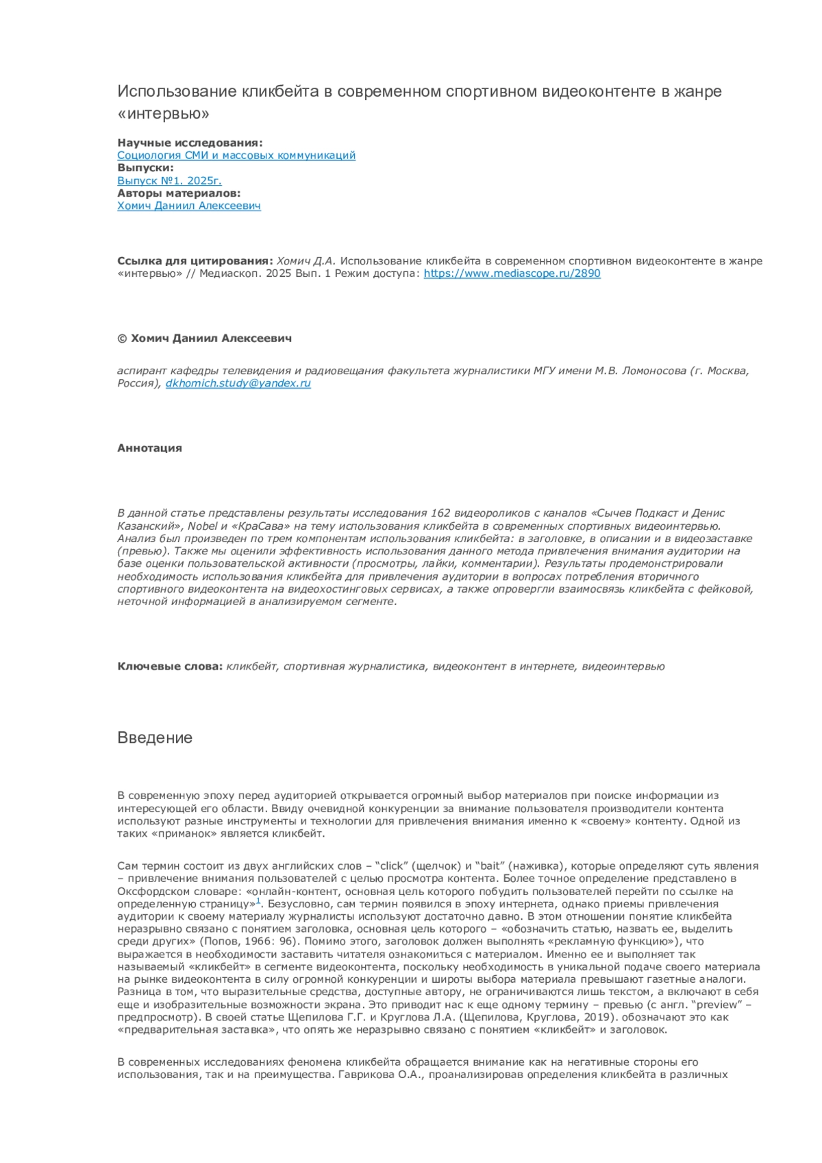 В данной статье представлены результаты исследования 162 видеороликов с каналов «Сычев Подкаст и Денис Казанский», Nobel и «КраСава» на тему использования кликбейта в современных спортивных видеоинтервью. Анализ был произведен по трем компонентам использования кликбейта: в заголовке, в описании и в видеозаставке (превью). Также мы оценили эффективность использования данного метода привлечения внимания аудитории на базе оценки пользовательской активности (просмотры, лайки, комментарии). Результаты продемонстрировали необходимость использования кликбейта для привлечения аудитории в вопросах потребления вторичного спортивного видеоконтента на видеохостинговых сервисах, а также опровергли взаимосвязь кликбейта с фейковой, неточной информацией в анализируемом сегменте.