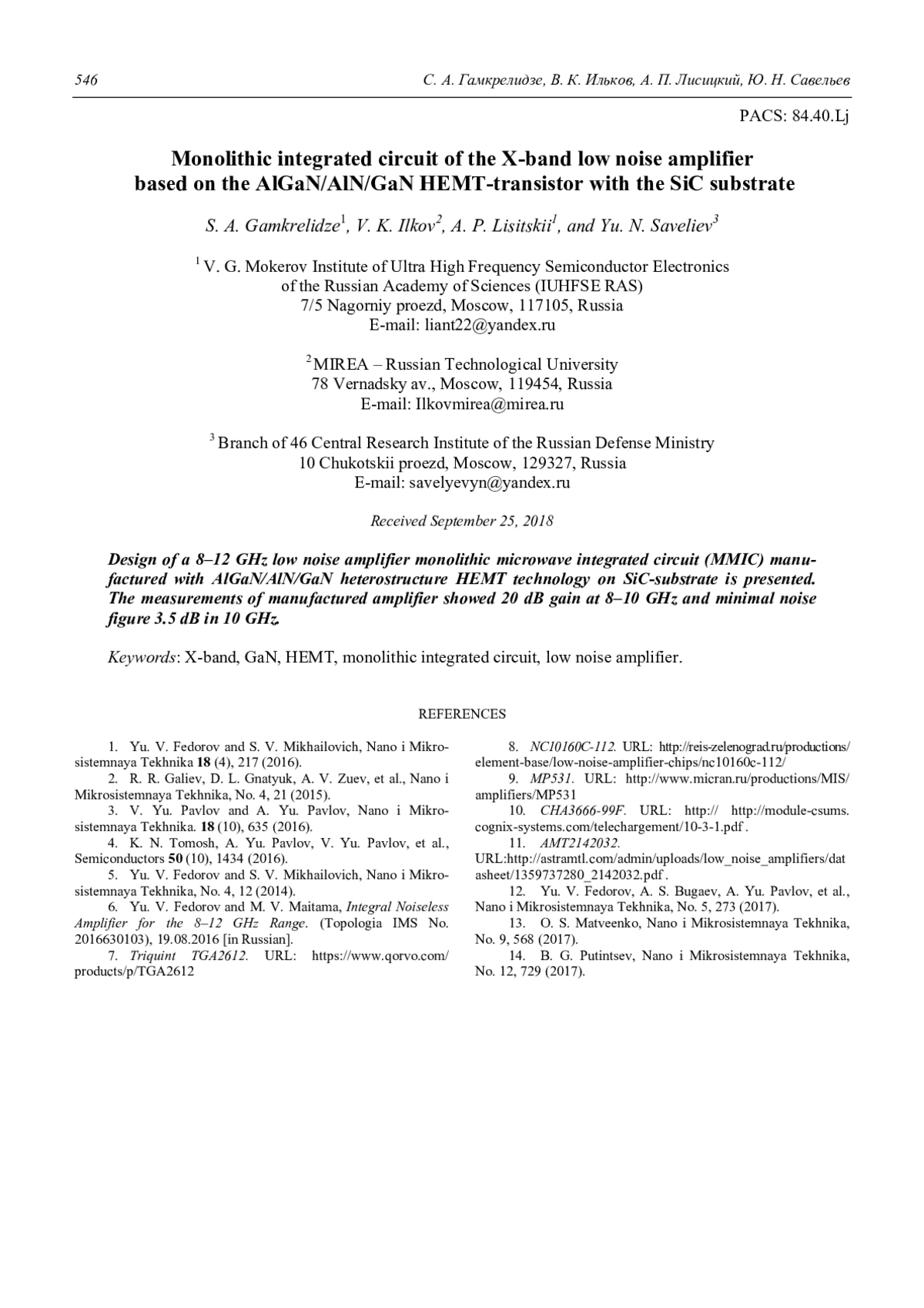 S. A. Gamkrelidze, V. K. Ilkov, A. P. Lisitskii, and Yu. N. Saveliev Monolithic integrated circuit of the X-band low noise amplifier based on the Al-GaN/AlN/GaN HEMT-transistor with the SiC substrate 542