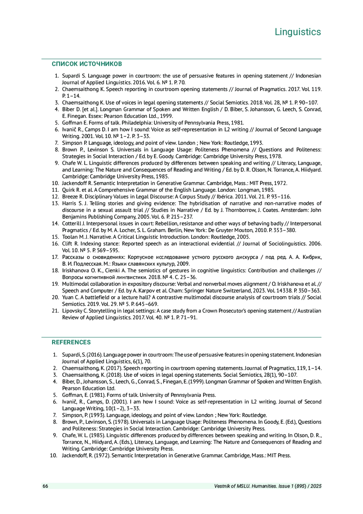 3. Chaemsaithong K. Use of voices in legal opening statements // Social Semiotics. 2018. Vol. 28, № 1. P. 90-107.