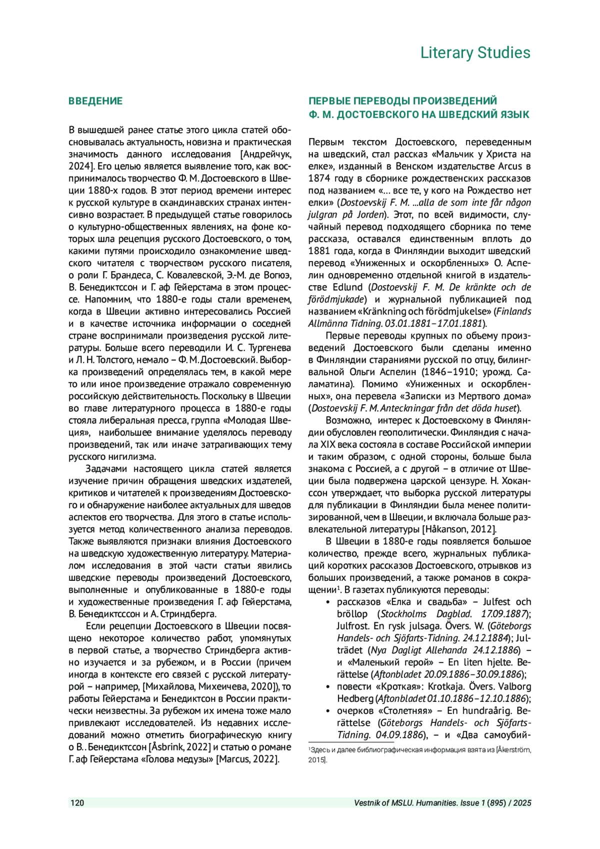 АНДРЕЙЧУК К. Р. РАННЯЯ РЕЦЕПЦИЯ ТВОРЧЕСТВА Ф. М. ДОСТОЕВСКОГО В ШВЕЦИИ (1880-Е ГОДЫ). СТАТЬЯ ВТОРАЯ // ВЕСТНИК МОСКОВСКОГО ГОСУДАРСТВЕННОГО ЛИНГВИСТИЧЕСКОГО УНИВЕРСИТЕТА. ГУМАНИТАРНЫЕ НАУКИ. 2025. № 1 (895)