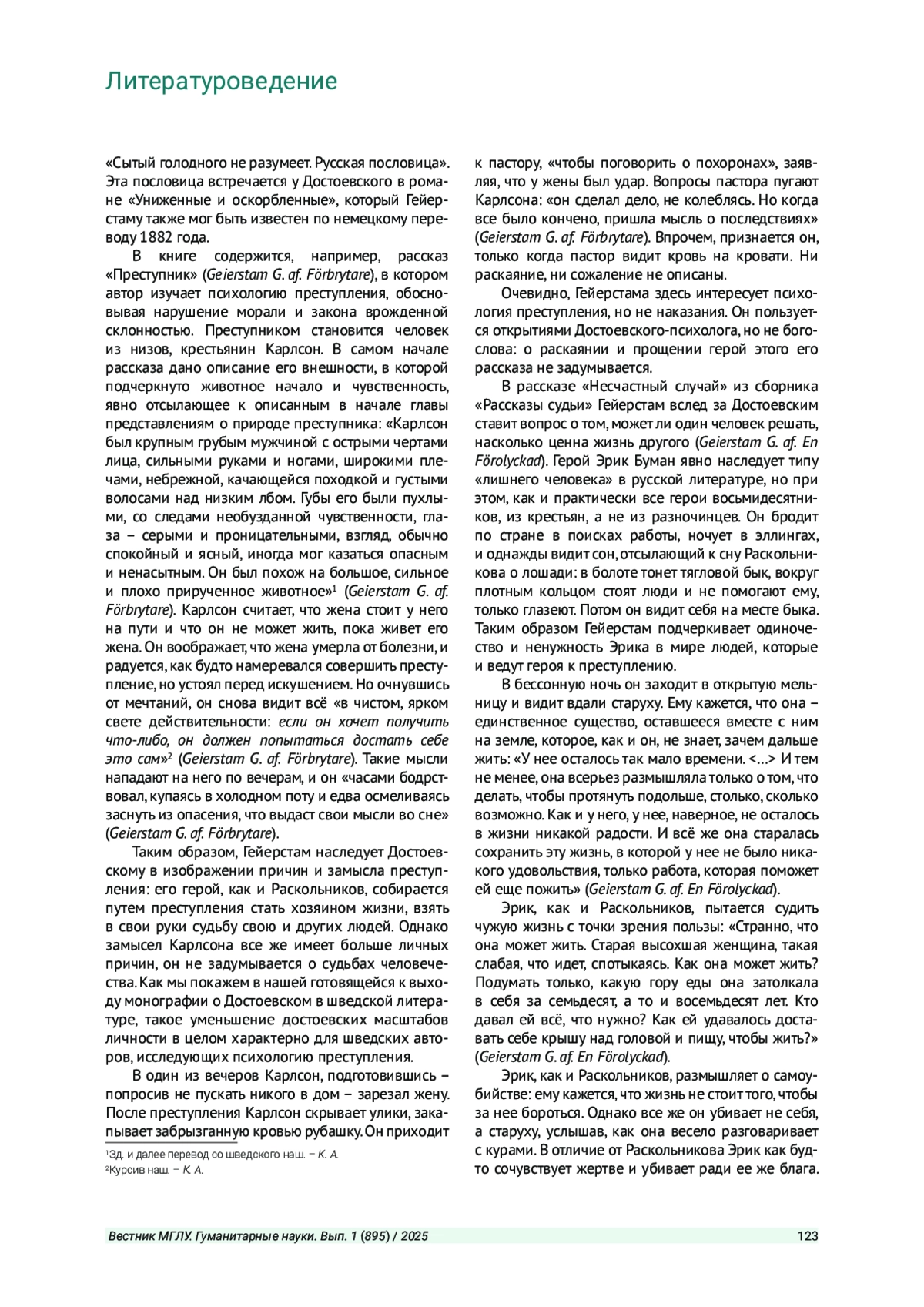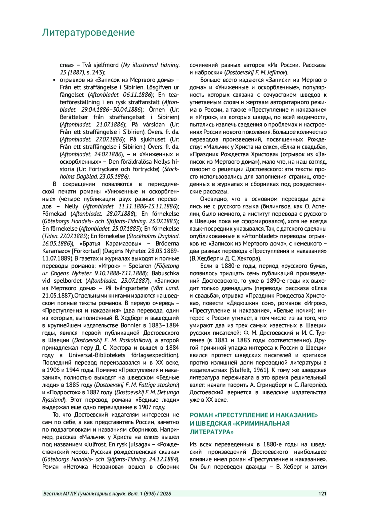 Статья: РАННЯЯ РЕЦЕПЦИЯ ТВОРЧЕСТВА Ф. М. ДОСТОЕВСКОГО В ШВЕЦИИ (1880-Е ГОДЫ). СТАТЬЯ ВТОРАЯ (2025)