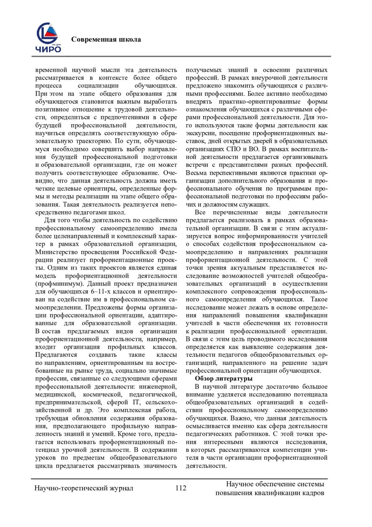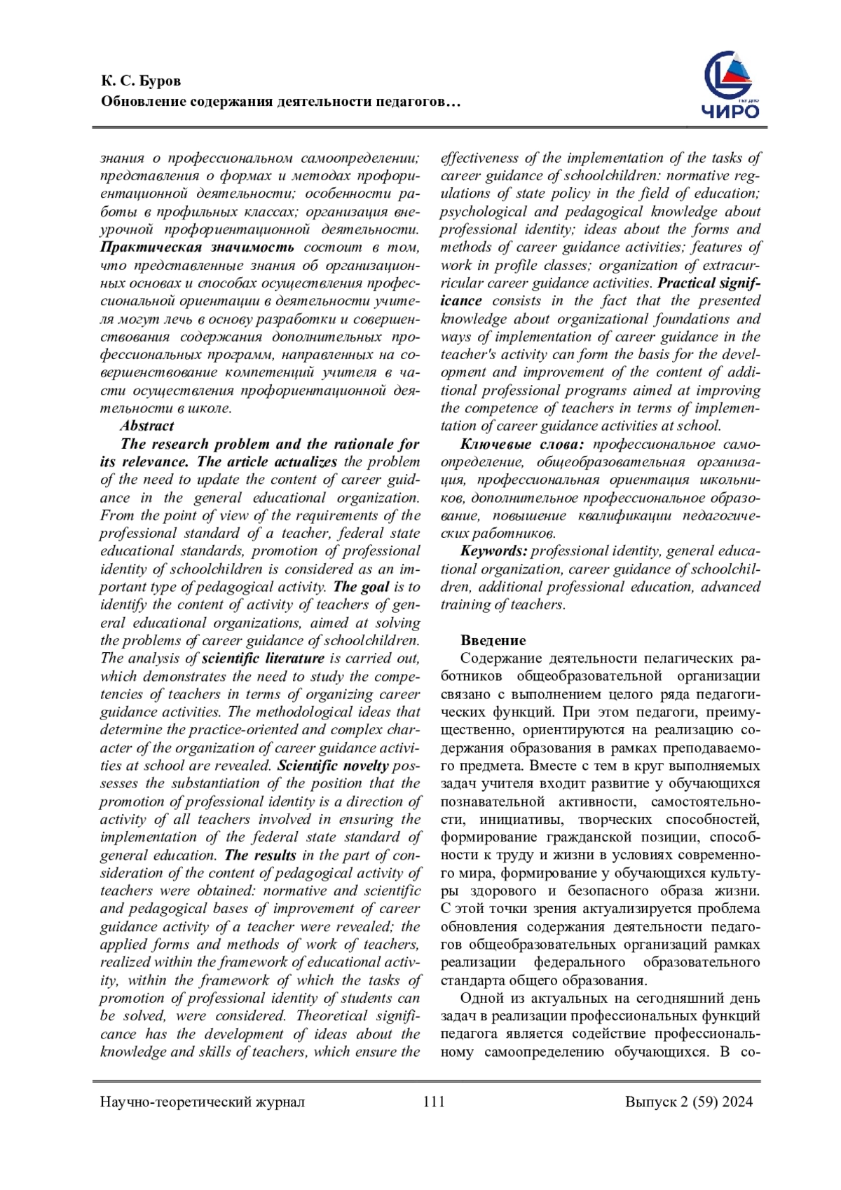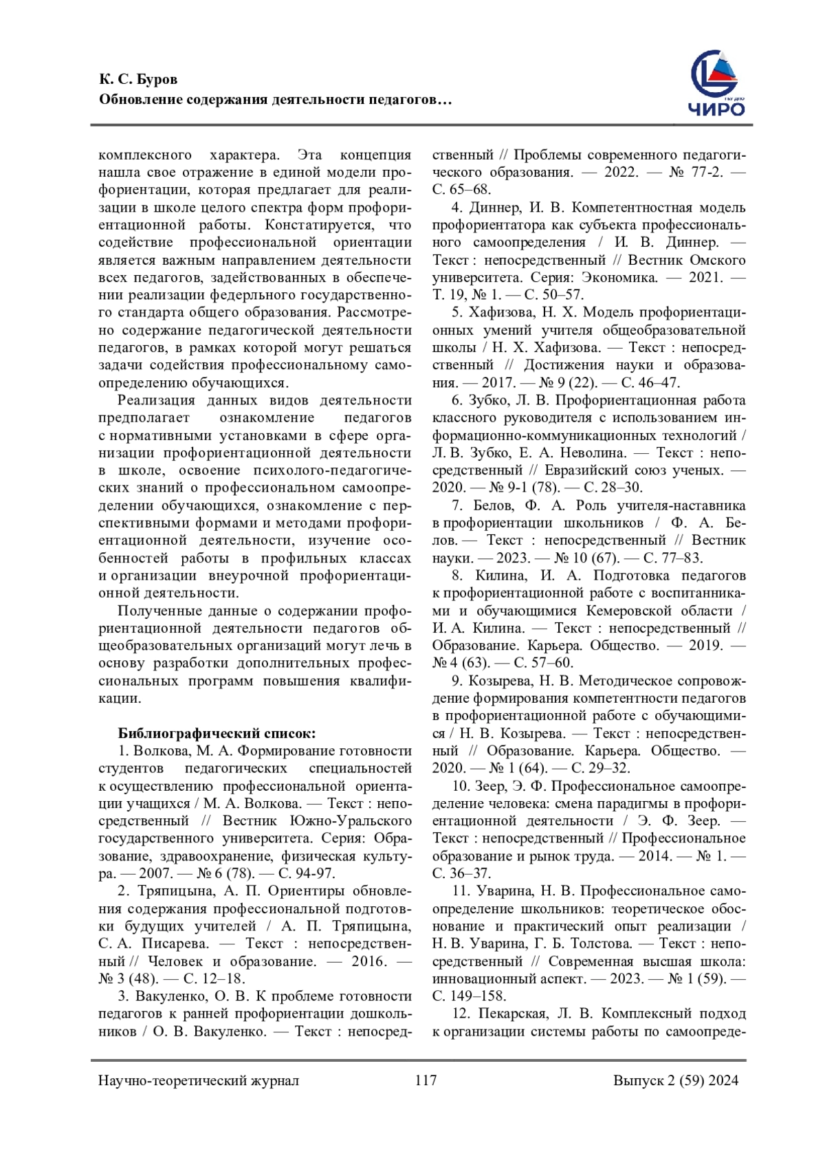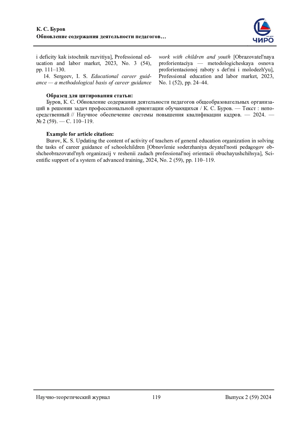 БУРОВ К. С. ОБНОВЛЕНИЕ СОДЕРЖАНИЯ ДЕЯТЕЛЬНОСТИ ПЕДАГОГОВ ОБЩЕОБРАЗОВАТЕЛЬНЫХ ОРГАНИЗАЦИЙ В РЕШЕНИИ ЗАДАЧ ПРОФЕССИОНАЛЬНОЙ ОРИЕНТАЦИИ ОБУЧАЮЩИХСЯ // НАУЧНОЕ ОБЕСПЕЧЕНИЕ СИСТЕМЫ ПОВЫШЕНИЯ КВАЛИФИКАЦИИ КАДРОВ. 2024. № 2 (59)