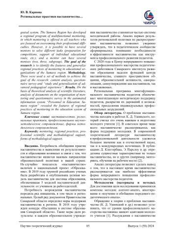 Проблема исследования и обоснование ее актуальности. Наставничество в России, как правило, относят к сфере методической поддержки молодых педагогов и их адаптации. Анализ международного и отечественного опыта развития наставничества в организациях показал, что условием их максимально инновационного развития выступает вовлечение как можно большего числа работников в наставническую деятельность. При этом один наставляемый может взаимодействовать сразу с несколькими наставниками: классическим наставником, тьютором, коучем, ментором, куратором. Один и тот же работник может для одного коллеги выступать в роли наставника, а по отношению к другому - в роли наставляемого. Такая разветвленная система наставничества приобретает характер многофункциональной, комплексной. В Самарской области разработана региональная программа многофункционального наставничества, в которой наставничество предлагается всем педагогам, ориентированным на преодоление своих профессиональных затруднений. При этом предусмотрена возможность иметь несколько наставников для решения разных задач (подготовки к конкурсам, сопровождения индивидуального образовательного маршрута и т. д.), но и у наставника может быть несколько наставляемых (двое, трое, подгруппа). Цель исследования: выявить особенности и обобщить региональные практики наставничества в образовательных организациях Самарской области. Методология (материалы и методы). Для достижения цели исследования применялся комплекс методов: контент-анализ, анкетирование и «изучение и обобщение передового педагогического опыта». Результаты. На основе теоретического анализа научной литературы, анализа документов по организации наставничества и анкетирования в автоматизированной информационной системе «Кадры в образовании. Самарская область» выявлены особенности региональных практик наставничества в системе образования Самарской области.