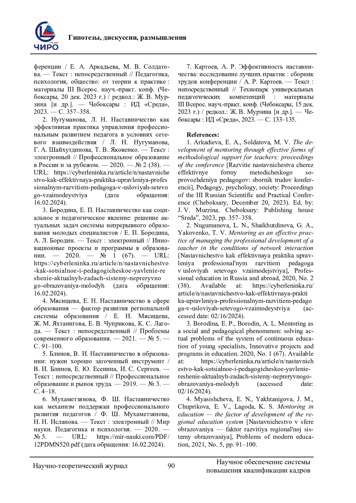 1. Аркадьева, Е. А. Развитие наставничества через эффективные формы методического сопровождения педагогов: сборник трудов конференции / Е. А. Аркадьева, М. В. Солдатова. - Текст: непосредственный // Педагогика, психология, общество: от теории к практике: материалы III Всерос. науч.-практ. конф. (Чебоксары, 20 дек. 2023 г.) / редкол.: Ж. В. Мурзина [и др.]. - Чебоксары: ИД “Среда”, 2023. - С. 357-358. EDN: HBUASZ