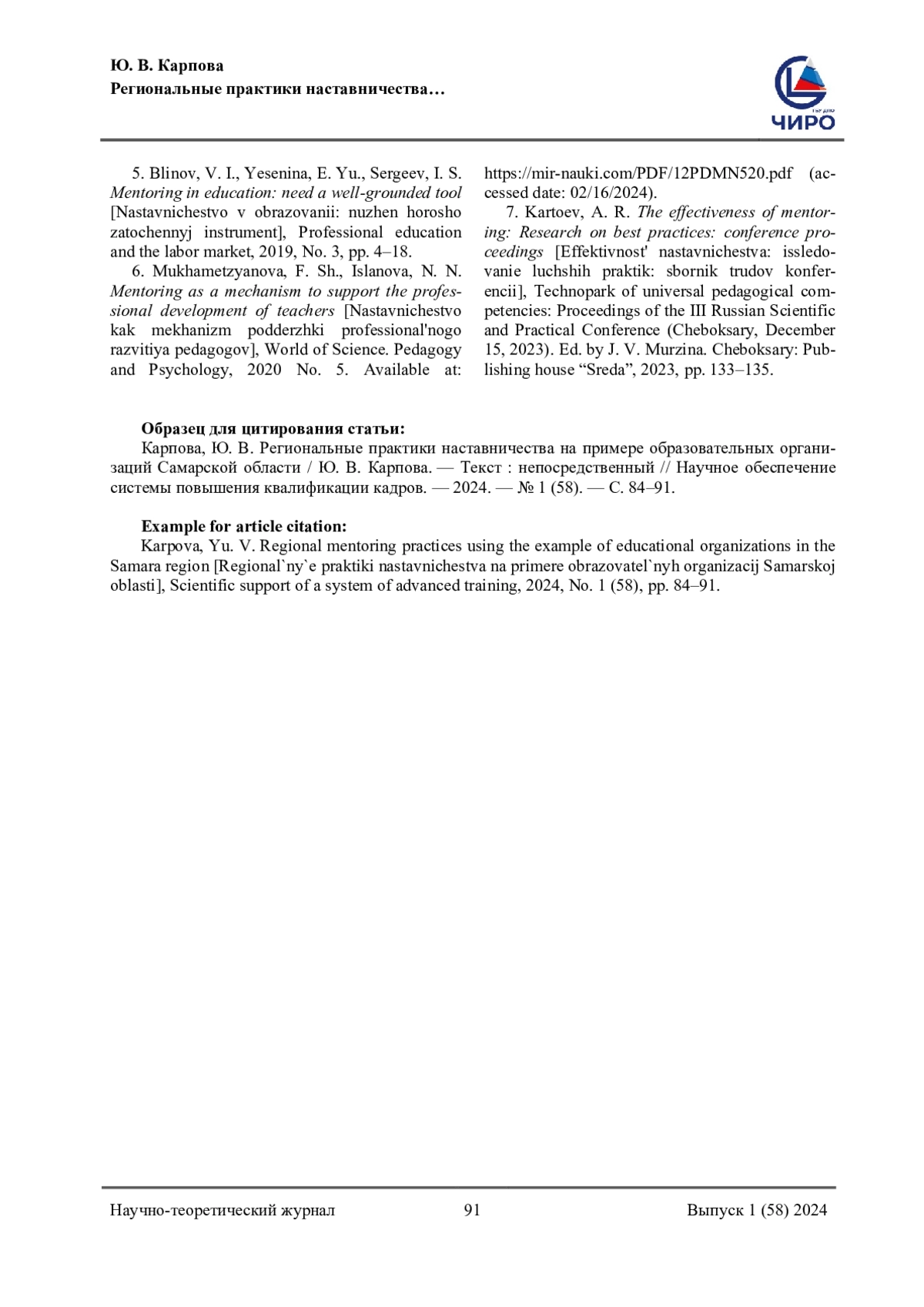5. Блинов, В. И. Наставничество в образовании: нужен хорошо заточенный инструмент / В. И. Блинов, Е. Ю. Есенина, И. С. Сергеев. - Текст: непосредственный // Профессиональное образование и рынок труда. - 2019. - № 3. - С. 4-18. EDN: XDEBKV