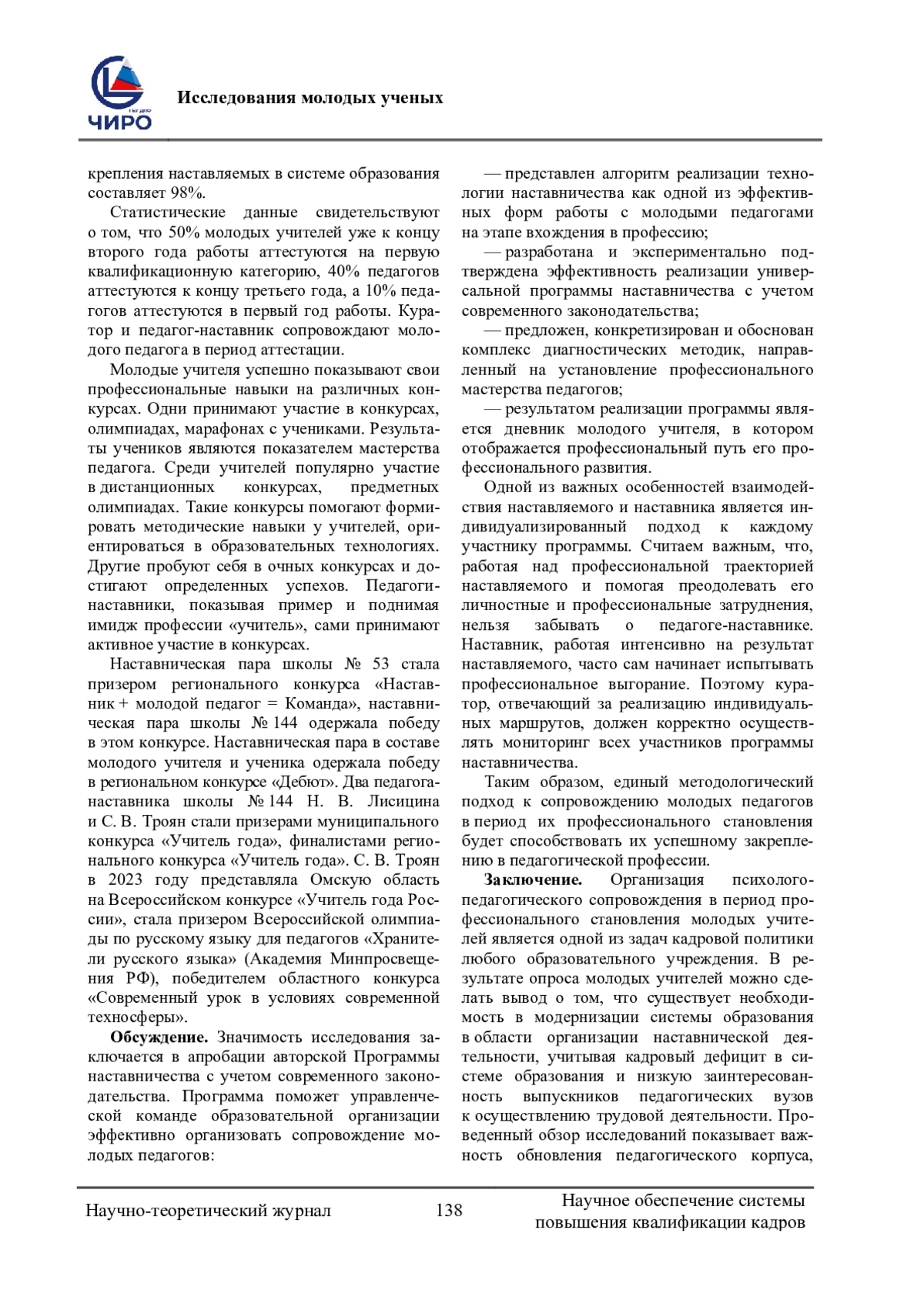 Проблема исследования и обоснование ее актуальности. В статье рассматривается вопрос о профессиональном становлении начинающего педагога и его закреплении в образовательных организациях. Отмечается проблема формирования педагогического коллектива и повышения профессионального уровня педагогов. Несмотря на рост требований к профессиональному мастерству педагогов, уровень их квалификации остается недостаточным. Педагогический корпус нуждается в обновлении с момента вхождения в профессию. Наблюдается низкая мотивация педагогических работников к совместной деятельности, направленной на их профессиональное развитие. Ставится цель представить результаты апробации технологии наставничества как одного из организационно-педагогических условий обеспечения качественного профессионального сопровождения молодых педагогов. Проводится обзор научных исследований, позволяющий установить значимость применения технологии наставничества в работе с педагогическим корпусом. Учитывается необходимость реализации в полном объеме государственной политики в сфере образования и поиском эффективной модели управления со стороны организации. Анализируются публикации, посвященные вопросу организации формального и информального образования учителей. Методологической основой исследования выступают положения системного и компетентного подходов. В них рассматривается становление психолого-педагогической компетентности молодого педагога. Проведен анализ нормативных документов с целью определения показателей уровня профессионального мастерства педагога. Описание результатов связывается с описанием модели наставнической деятельности, которая представлена авторской Программой наставничества. Программа включает перечень мероприятий по подбору основного педагога-наставника для молодого учителя, по определению наставнических групп с целью определения профессиональной траектории развития начинающего специалиста с учетом его профессиональных возможностей. В статье описан опыт внедрения Программы наставничества. Практическая значимость представленных результатов заключается в возможности их применения при принятии управленческих решений с целью создания условий для профессионального развития педагогов-наставников и закрепления в профессии наставляемых. Обсуждается диагностический инструментарий с целью выявления профессиональных возможностей и дефицитов молодых педагогов.