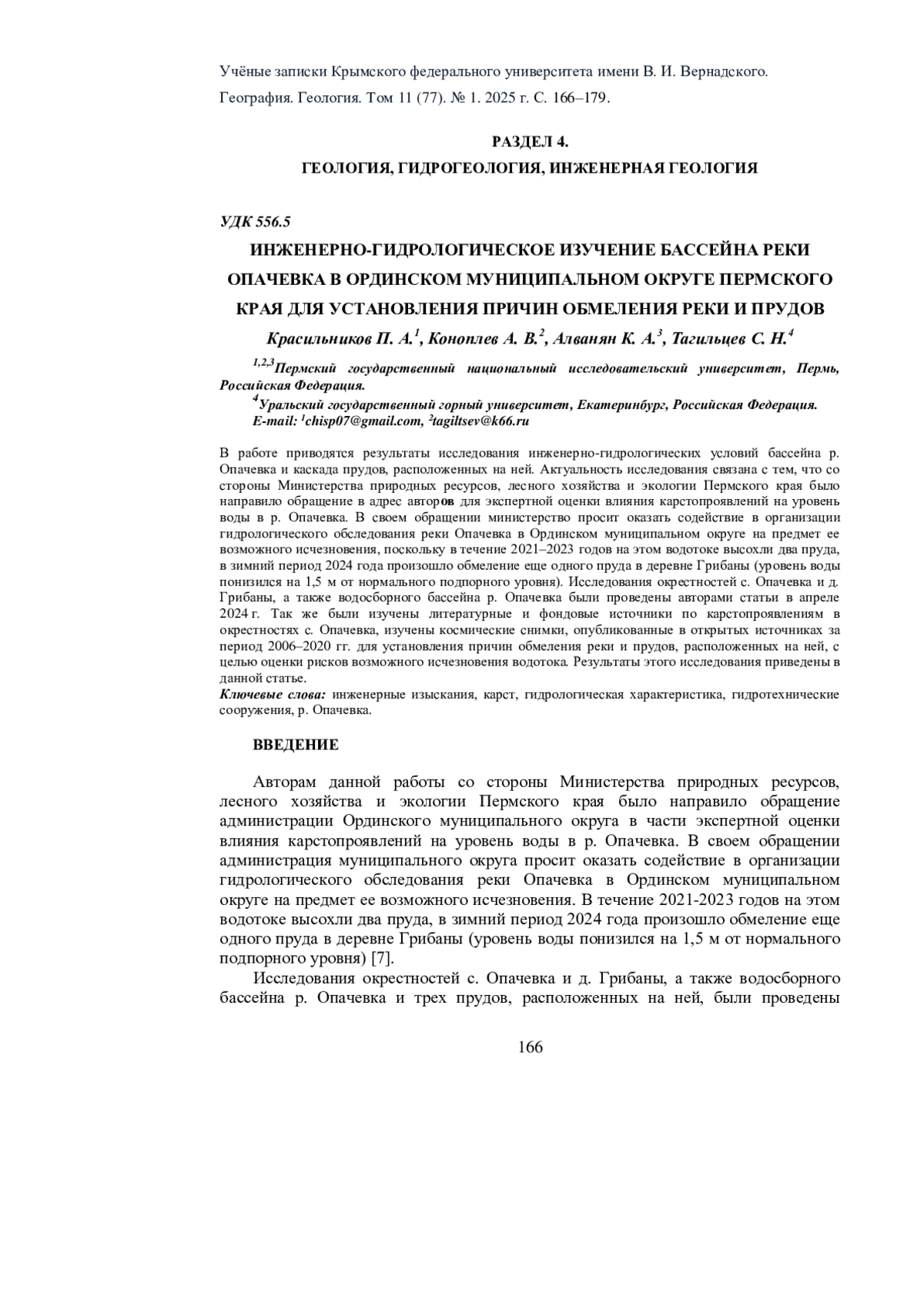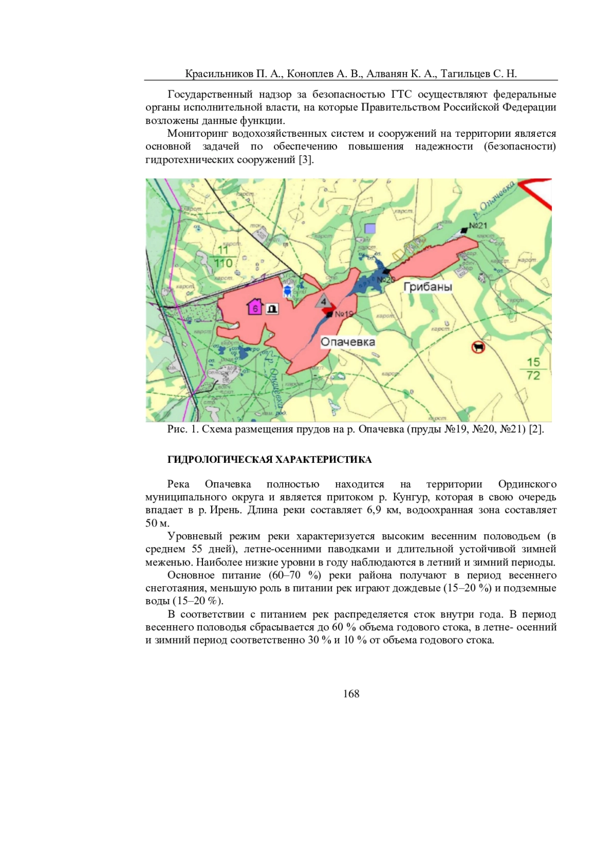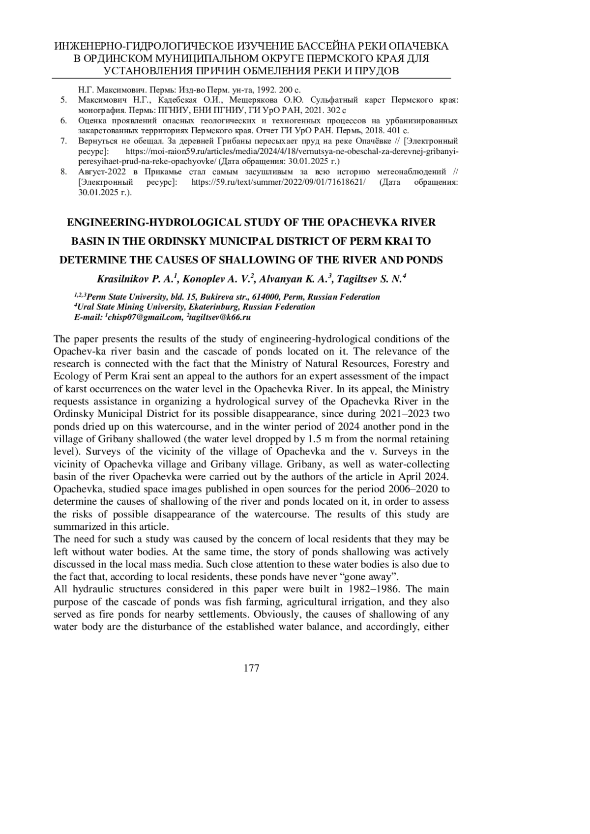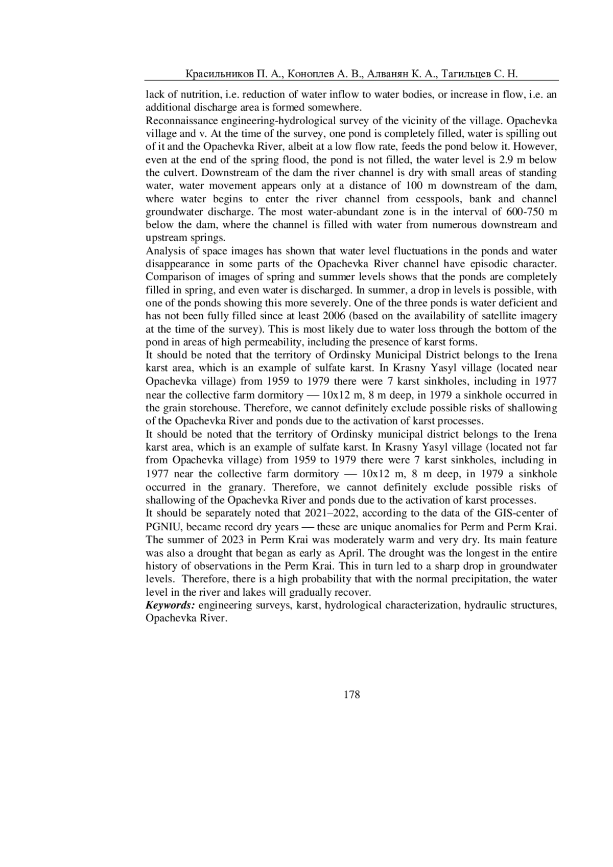В работе приводятся результаты исследования инженерно-гидрологических условий бассейна р. Опачевка и каскада прудов, расположенных на ней. Актуальность исследования связана с тем, что со стороны Министерства природных ресурсов, лесного хозяйства и экологии Пермского края было направило обращение в адрес авторов для экспертной оценки влияния карстопроявлений на уровень воды в р. Опачевка. В своем обращении министерство просит оказать содействие в организации гидрологического обследования реки Опачевка в Ординском муниципальном округе на предмет ее возможного исчезновения, поскольку в течение 2021-2023 годов на этом водотоке высохли два пруда, в зимний период 2024 года произошло обмеление еще одного пруда в деревне Грибаны (уровень воды понизился на 1,5 м от нормального подпорного уровня). Исследования окрестностей с. Опачевка и д. Грибаны, а также водосборного бассейна р. Опачевка были проведены авторами статьи в апреле 2024 г. Так же были изучены литературные и фондовые источники по карстопроявлениям в окрестностях с. Опачевка, изучены космические снимки, опубликованные в открытых источниках за период 2006-2020 гг. для установления причин обмеления реки и прудов, расположенных на ней, с целью оценки рисков возможного исчезновения водотока. Результаты этого исследования приведены в данной статье.