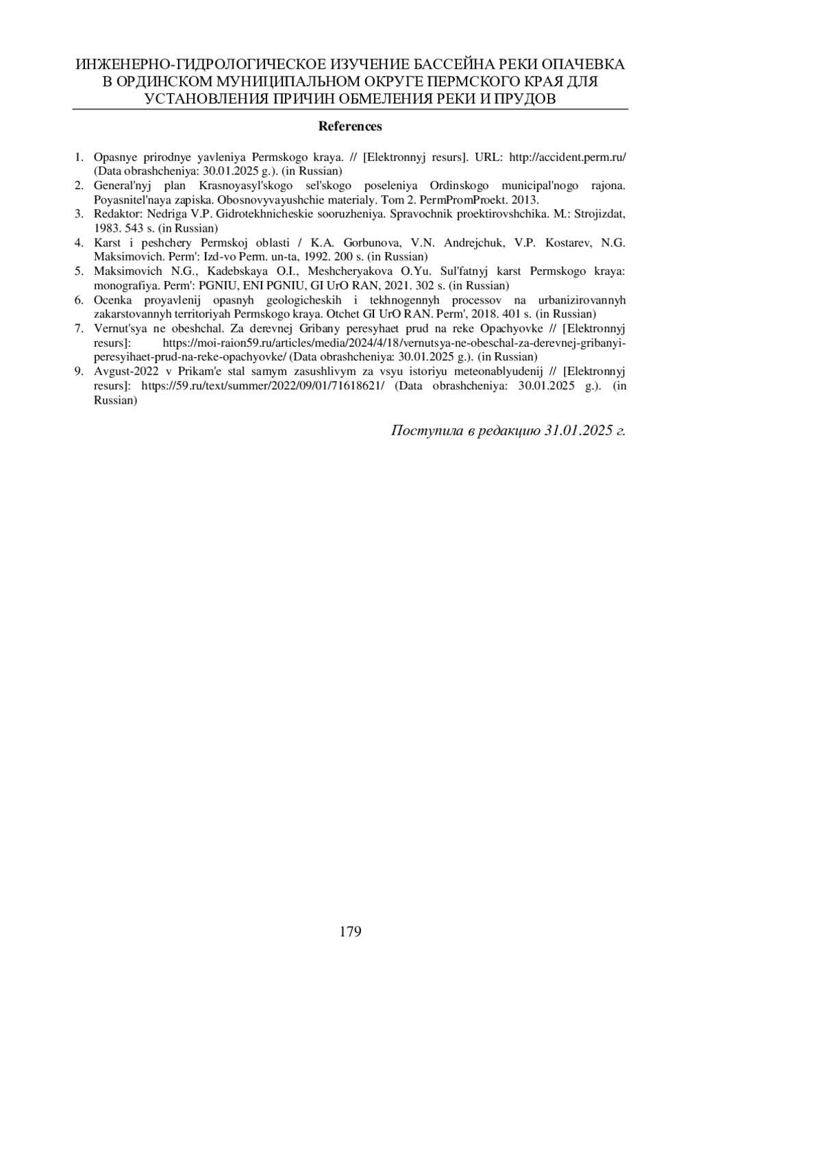 5. Максимович Н.Г., Кадебская О.И., Мещерякова О.Ю. Сульфатный карст Пермского края: монография. Пермь: ПГНИУ, ЕНИ ПГНИУ, ГИ УрО РАН, 2021. 302 с. EDN: JXXWCV