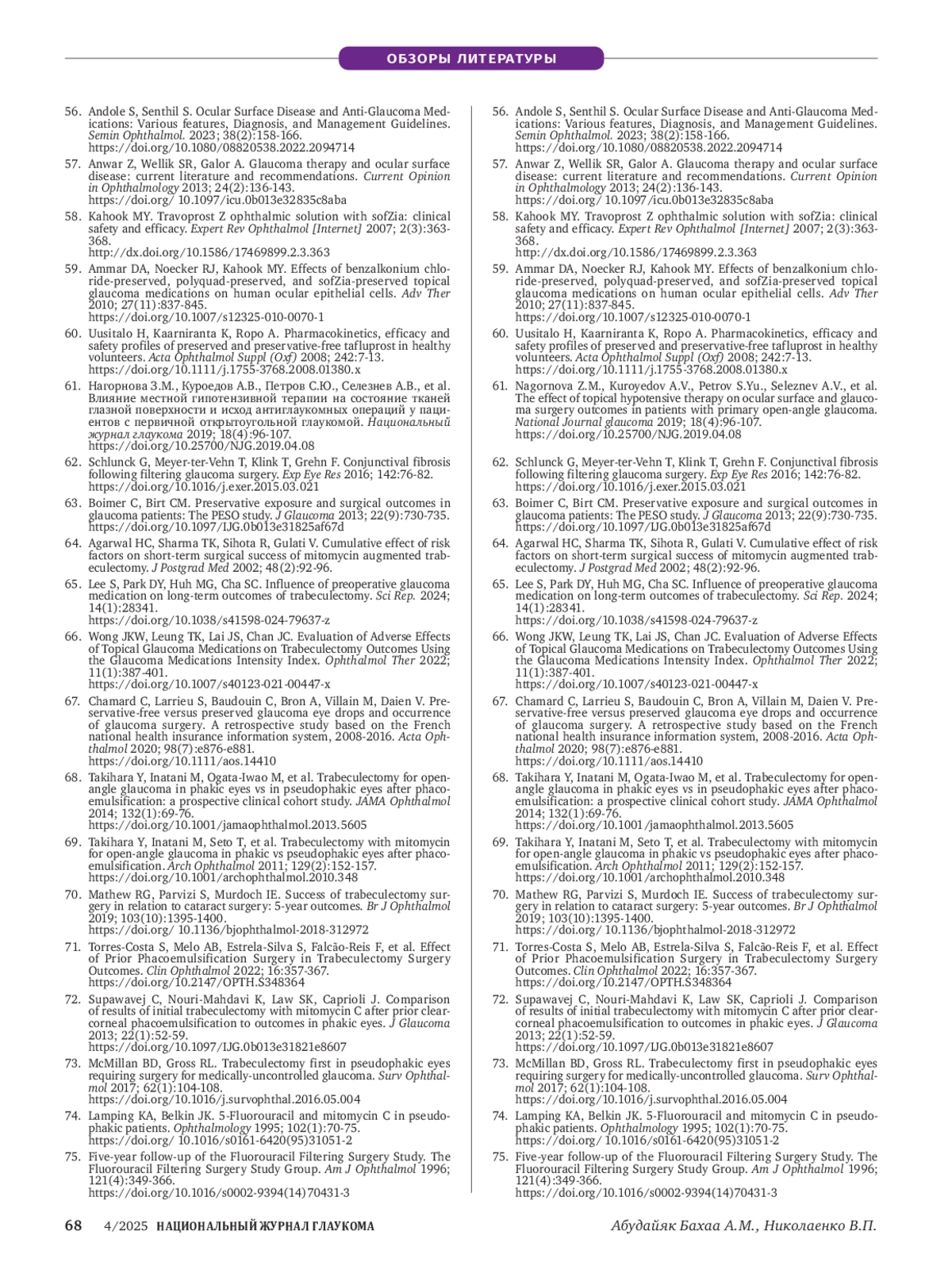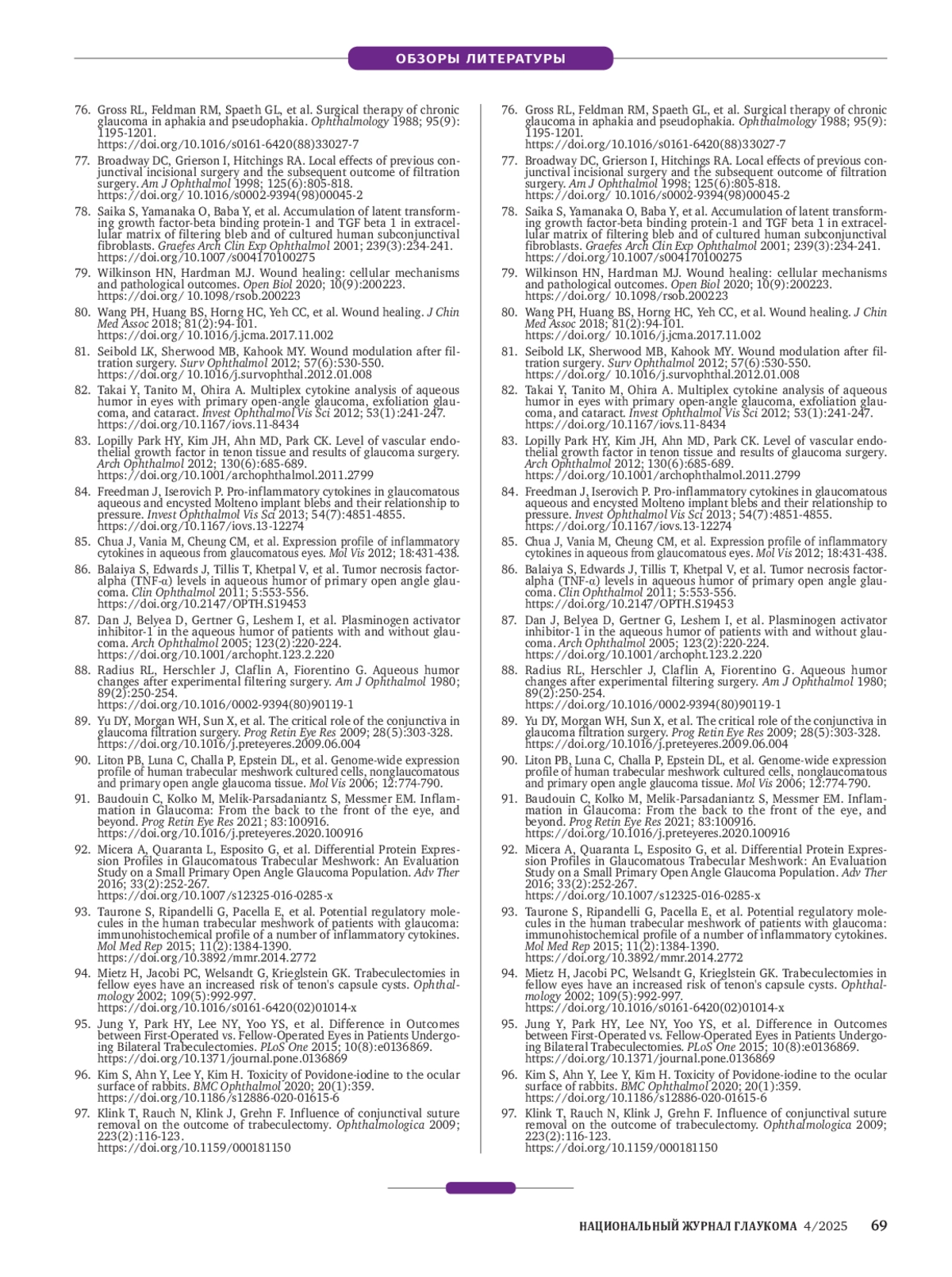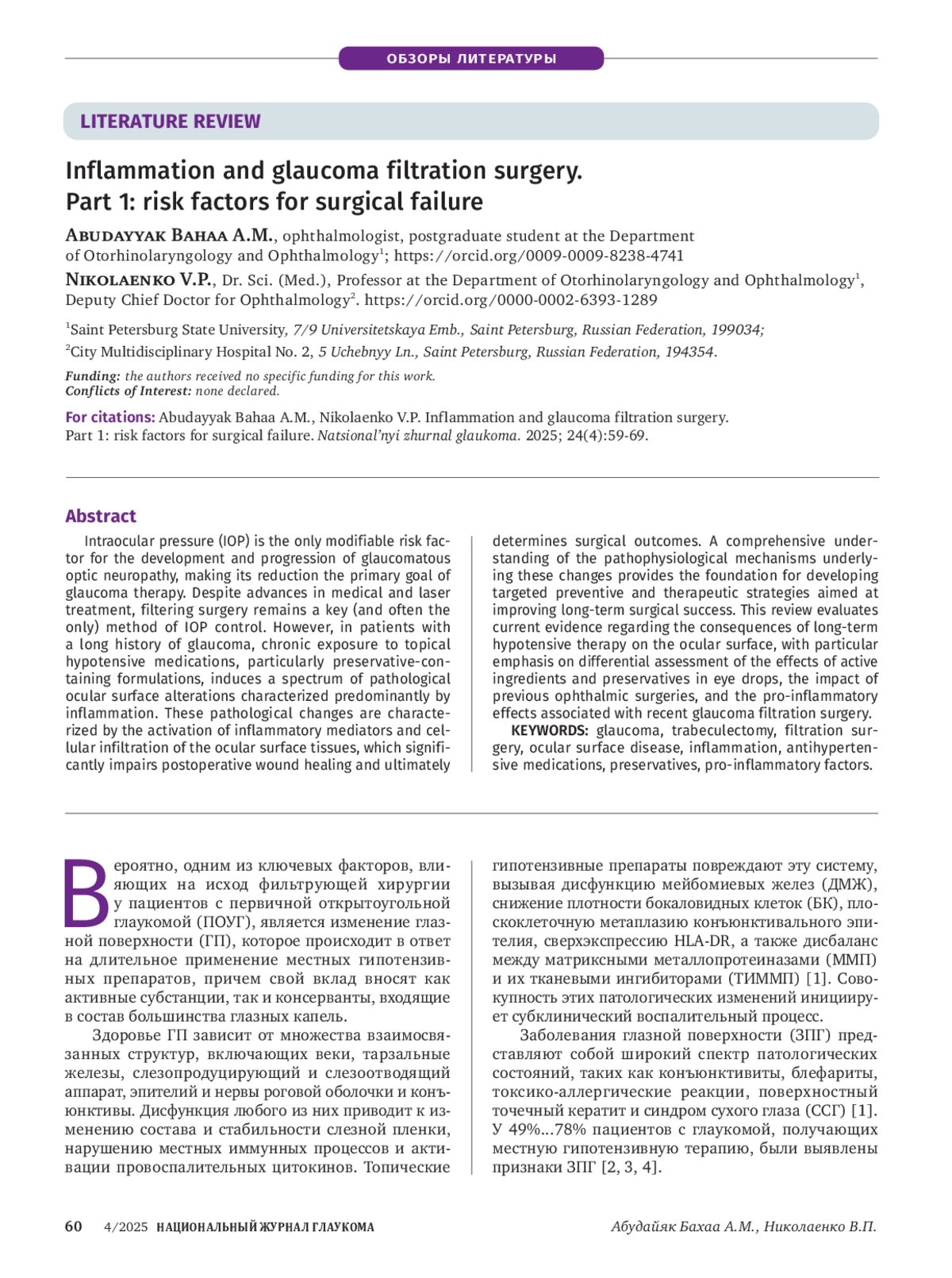 АБУДАЙЯК Б. А., НИКОЛАЕНКО В. П. ВОСПАЛЕНИЕ И ФИЛЬТРУЮЩАЯ ХИРУРГИЯ ГЛАУКОМЫ. ЧАСТЬ 1: ФАКТОРЫ РИСКА НЕУДАЧИ ОПЕРАЦИИ // НАЦИОНАЛЬНЫЙ ЖУРНАЛ ГЛАУКОМА. 2025. № 4, ТОМ 24