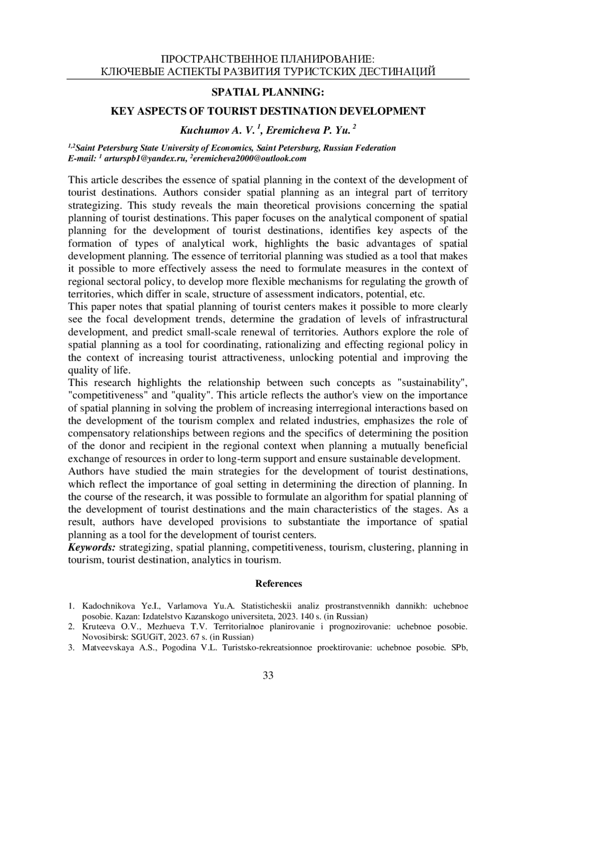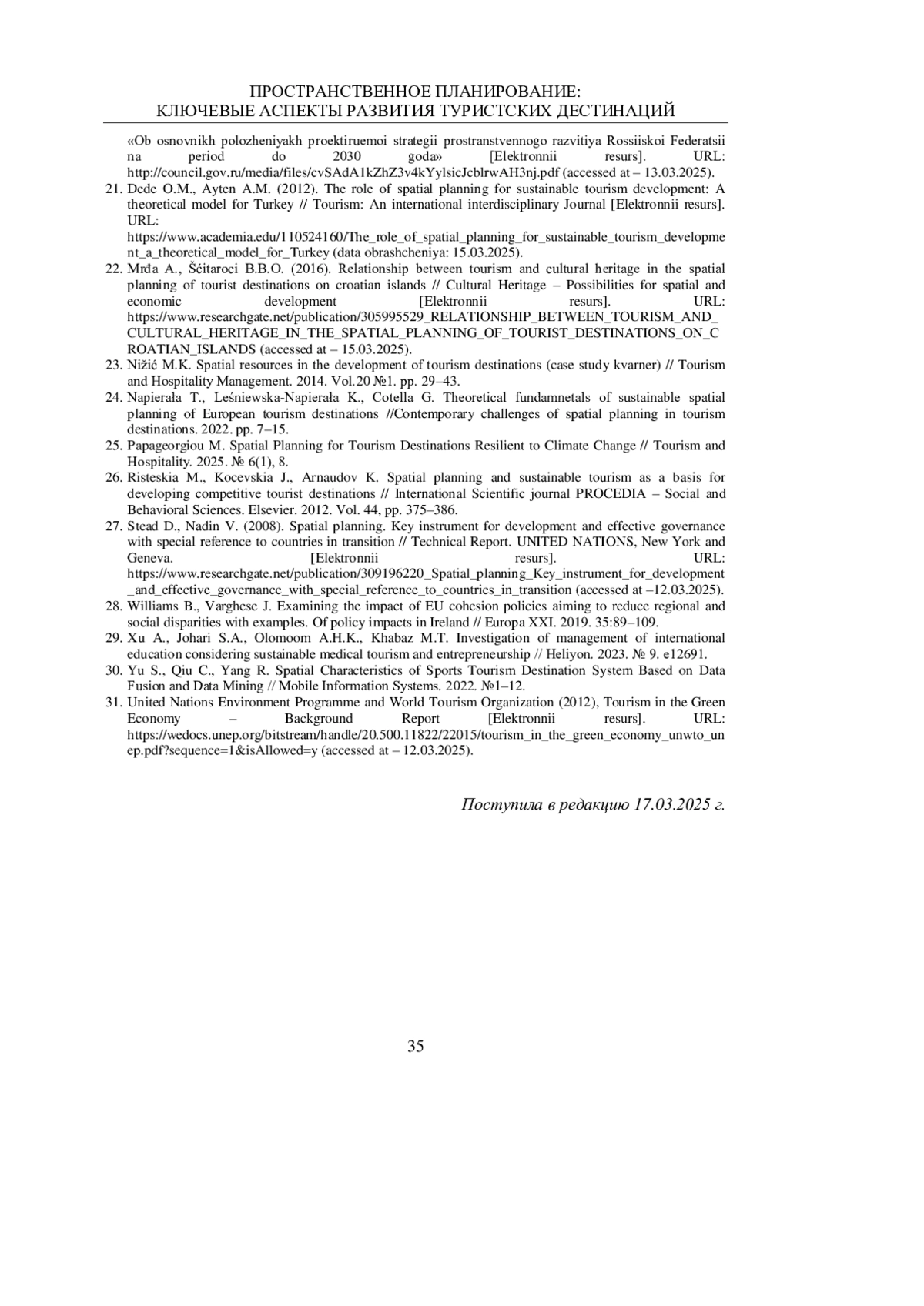 21. Dede O.M., Ayten A.M. (2012). The role of spatial planning for sustainable tourism development: A theoretical model for Turkey // Tourism: An international interdisciplinary Journal [Электронный ресурс]. URL: https://www.academia.edu/110524160/The_role_of_spatial_planning_for_sustainable_tourism_development_a_theoretical_model_for_Turkey (дата обращения: 15.03.2025).
