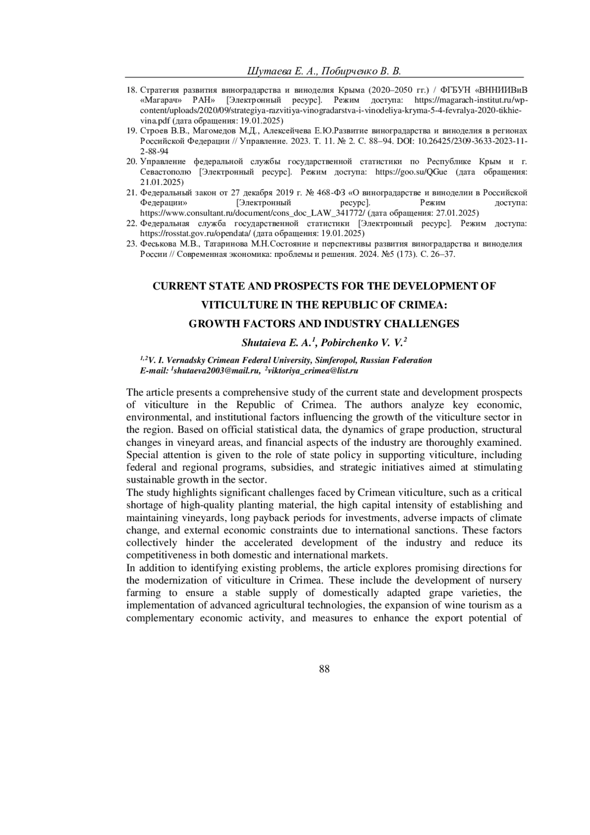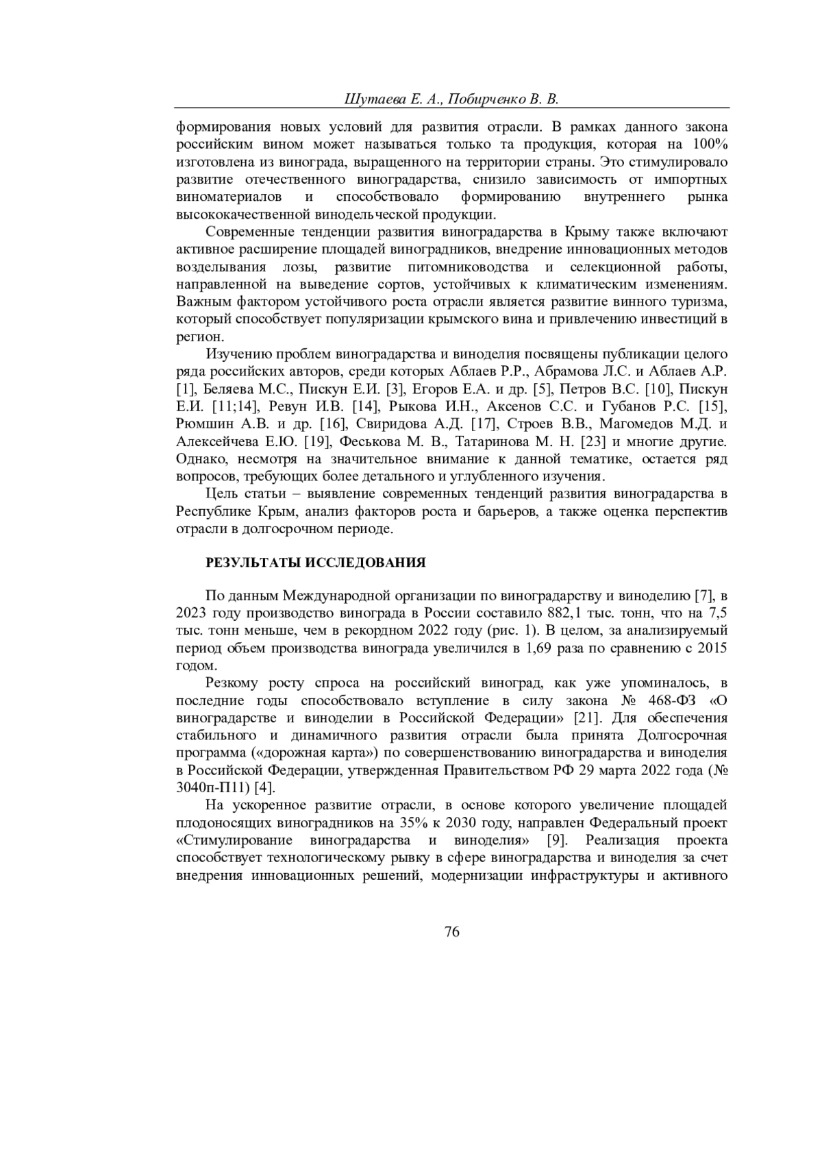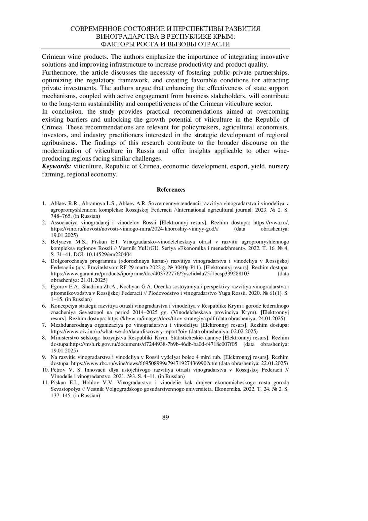 1. Аблаев Р.Р., Абрамова Л.С., Аблаев А.Р. Современные тенденции развития виноградарства и виноделия в агропромышленном комплексе Российской Федерации //International agricultural journal. 2023. № 2. С. 748-765.