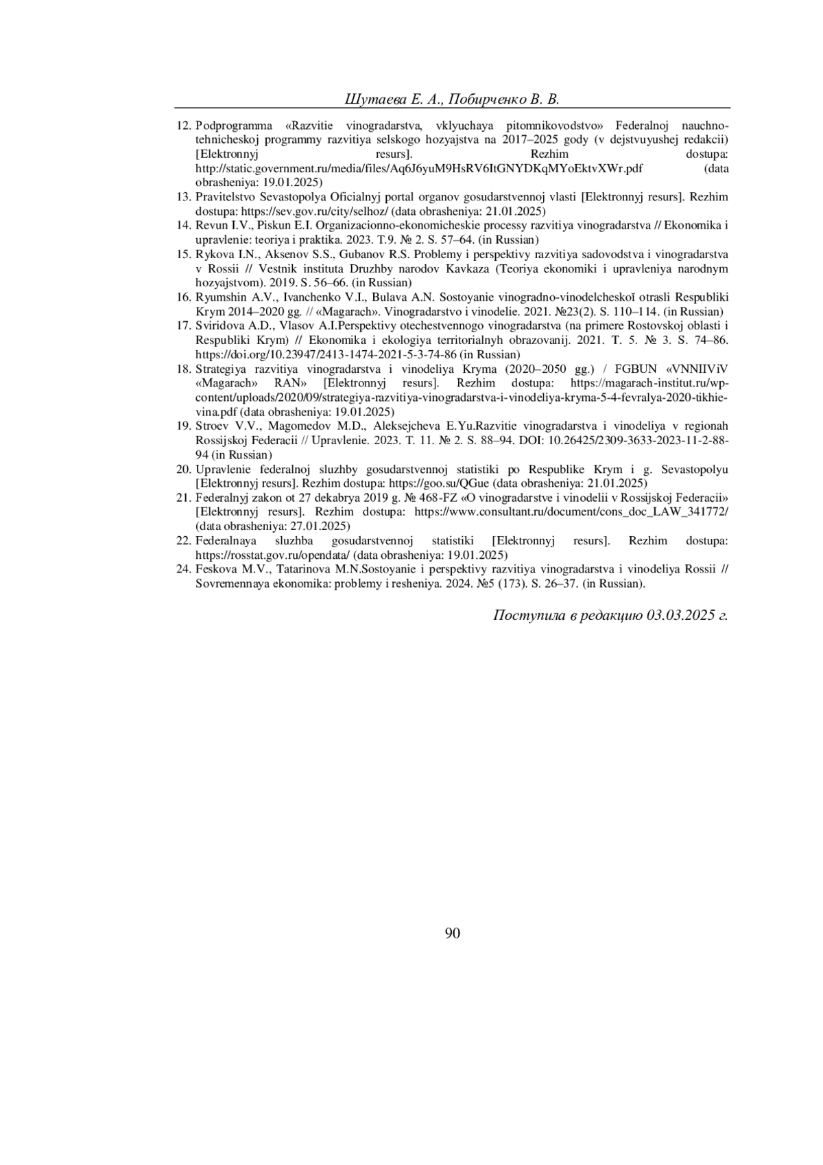 5. Егоров Е.А., Шадрина Ж.А., Кочьян Г.А. Оценка состояния и перспективы развития виноградарства и питомниководства в Российской Федерации // Плодоводство и виноградарство Юга России. 2020. № 61(1). С. 1-15. EDN: LZHGRE