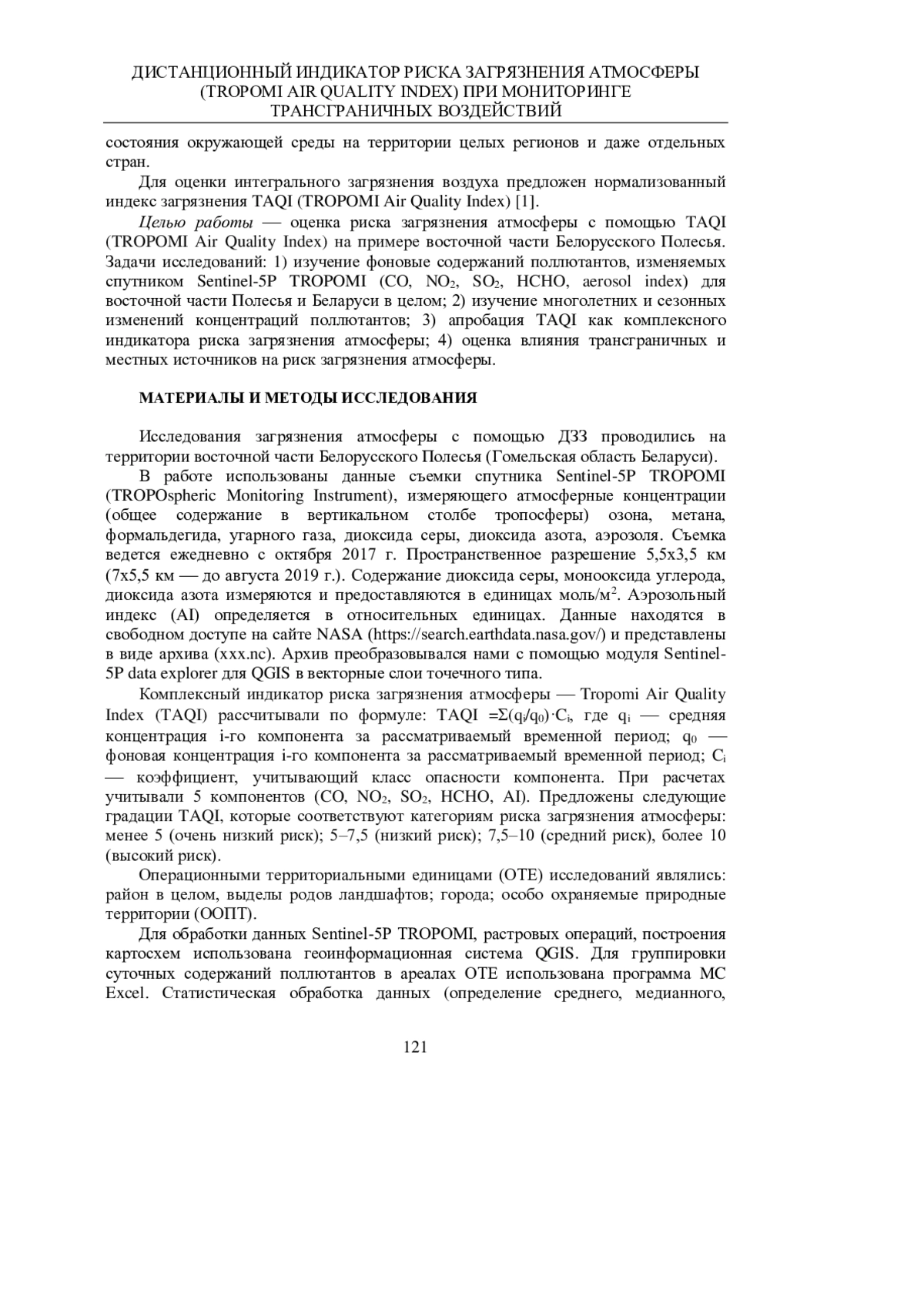 Работа посвящена апробации комплексного индикатора риска загрязнения атмосферы TAQI (TROPOMI Air Quality Index). TAQI рассчитывается по 5 компонентам (CO, NO2, SO2, HCHO, аэрозоли), которые определяются спутником Sentinel-5P TROPOMI. На примере восточной части Белорусского Полесья определены пространственно-временные колебания тропосферных содержаний CO, NO2, SO2, HCHO и аэрозолей. Обнаружены существенные изменения TAQI, обусловленные трансграничными воздействиями. В апреле 2024 г. зафиксированы две аномалии резкого роста значений TAQI (высокий риск загрязнения), вызванные пыльной бурей в северной Африке и техногенными выбросами NO2 и SO2. Колебания TAQI неоднородны в пространстве и зависят от особенностей движения воздушных масс и поллютантов. Зоны высокого риска загрязнения атмосферы, возникающие в периоды трансграничных воздействий, могут охватывать значительные площади (более половины территории региона).