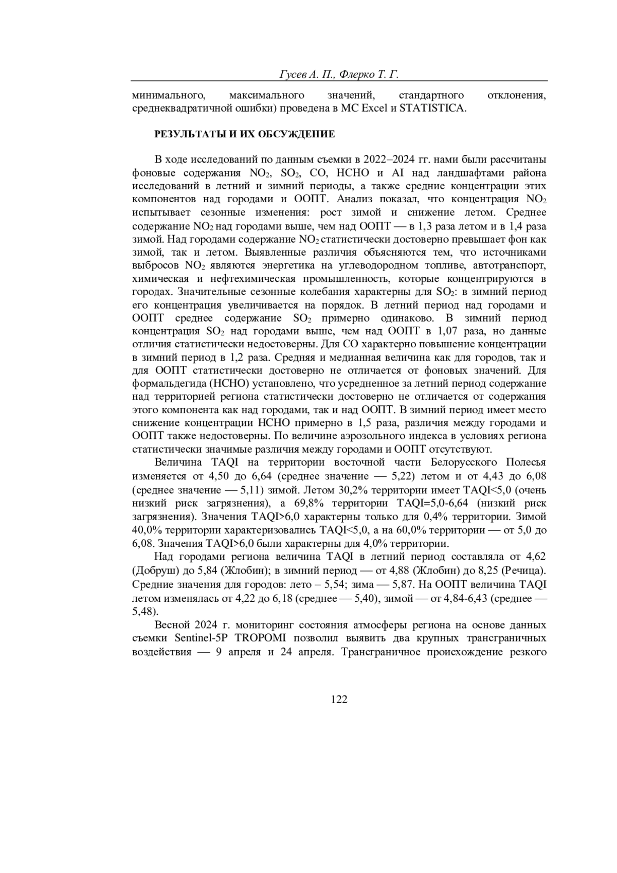 3. Гусев А.П., Флерко Т.Г. Оценка риска загрязнения атмосферы на основе космической съемки Sentinel-5P TROPOMI (на примере восточной части Белорусского Полесья) // Российский журнал прикладной экологии. 2024. №4. С.4-9. EDN: WUPHVQ