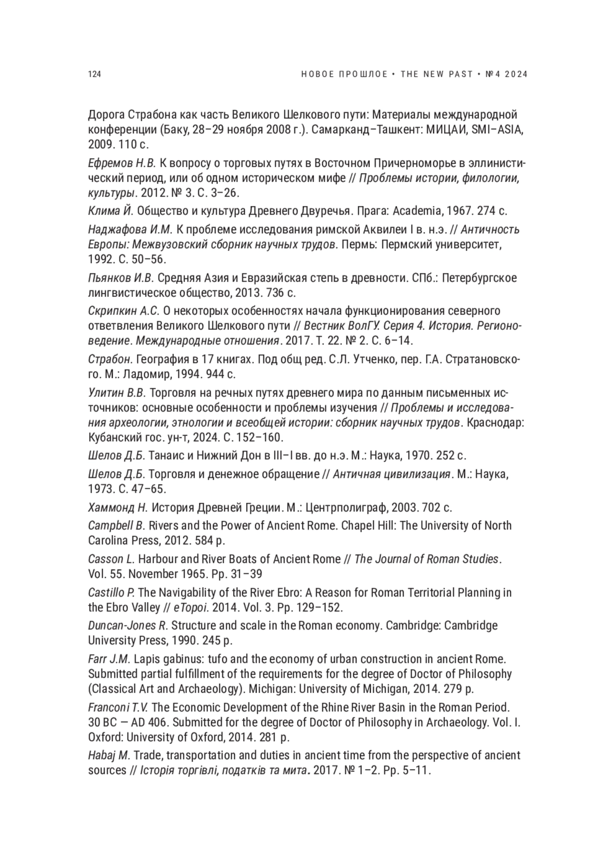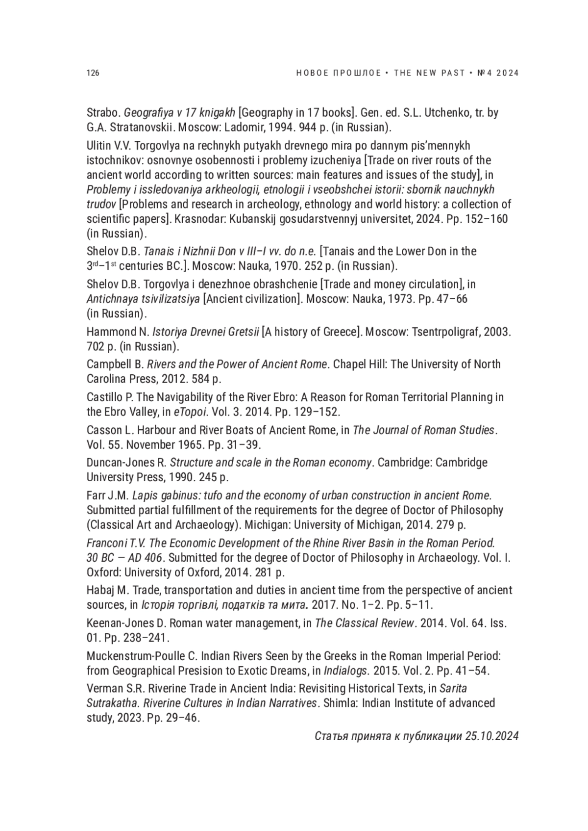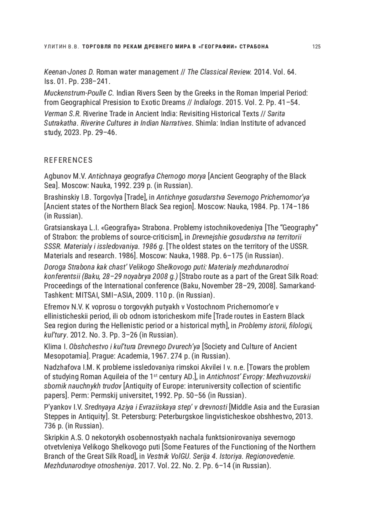 11. Улитин В.В. Торговля на речных путях древнего мира по данным письменных источников: основные особенности и проблемы изучения // Проблемы и исследования археологии, этнологии и всеобщей истории: сборник научных трудов. Краснодар: Кубанский гос. ун-т, 2024. С. 152-160. EDN: UESVOB