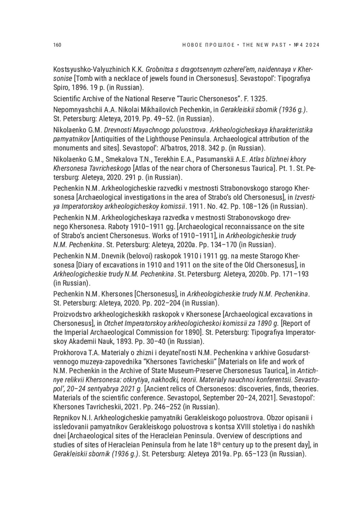 22. Печёнкин Н.М. Археологическая разведка в местности Страбоновского древнего Херсонеса. Работы 1910-1911 гг. // Археологические труды Н.М. Печёнкина. СПб.: Алетейя, 2020а. С. 134-170. EDN: IFOEDN