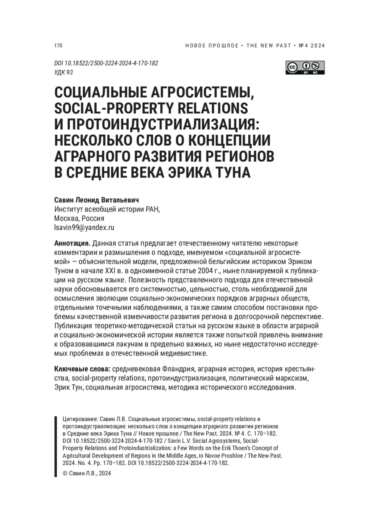 Данная статья предлагает отечественному читателю некоторые комментарии и размышления о подходе, именуемом «социальной агросистемой» — объяснительной модели, предложенной бельгийским историком Эриком Туном в начале XXI в. в одноименной статье 2004 г., ныне планируемой к публикации на русском языке. Полезность представленного подхода для отечественной науки обосновывается его системностью, цельностью, столь необходимой для осмысления эволюции социально-экономических порядков аграрных обществ, отдельными точечными наблюдениями, а также самим способом постановки проблемы качественной изменчивости развития региона в долгосрочной перспективе. Публикация теоретико-методической статьи на русском языке в области аграрной и социально-экономической истории является также попыткой привлечь внимание к образовавшимся лакунам в предельно важных, но ныне недостаточно исследуемых проблемах в отечественной медиевистике