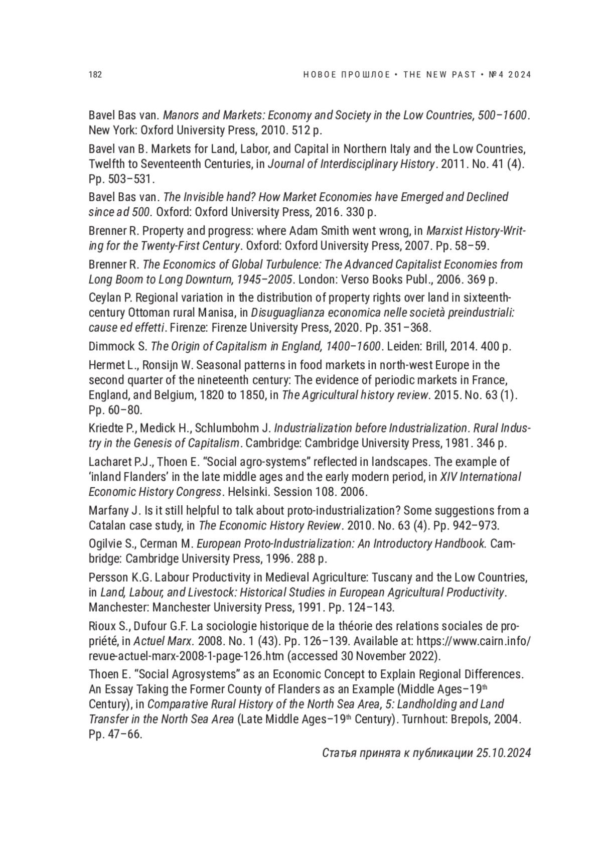 19. Bavel van B. Markets for Land, Labor, and Capital in Northern Italy and the Low Countries, Twelfth to Seventeenth Centuries // Journal of Interdisciplinary History. 2011. № 41 (4). Pp. 503-531.