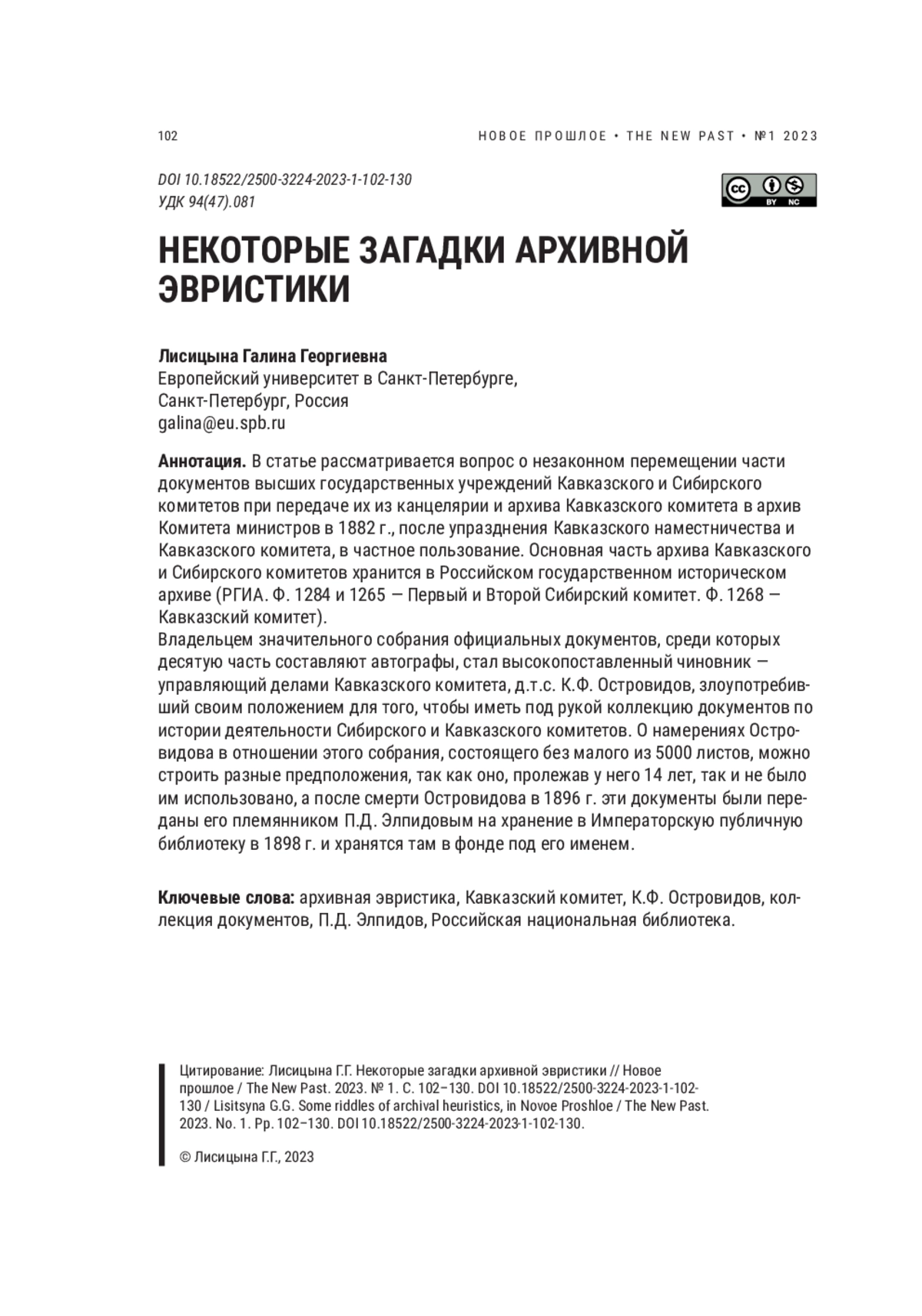 ЛИСИЦЫНА Г. Г. НЕКОТОРЫЕ ЗАГАДКИ АРХИВНОЙ ЭВРИСТИКИ // НОВОЕ ПРОШЛОЕ. 2023. № 1