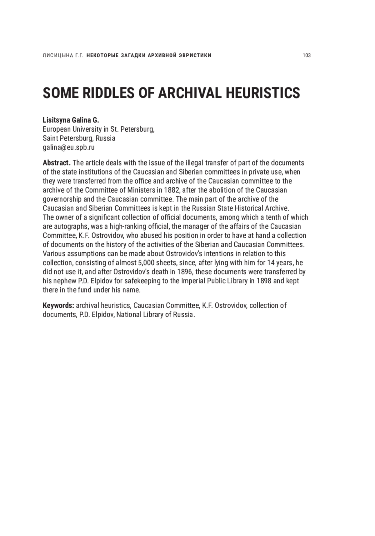 Ключевые фразы: архивная эвристика, кавказский комитет, кф островидов, коллекция документов, пд элпидов, российская национальная библиотека