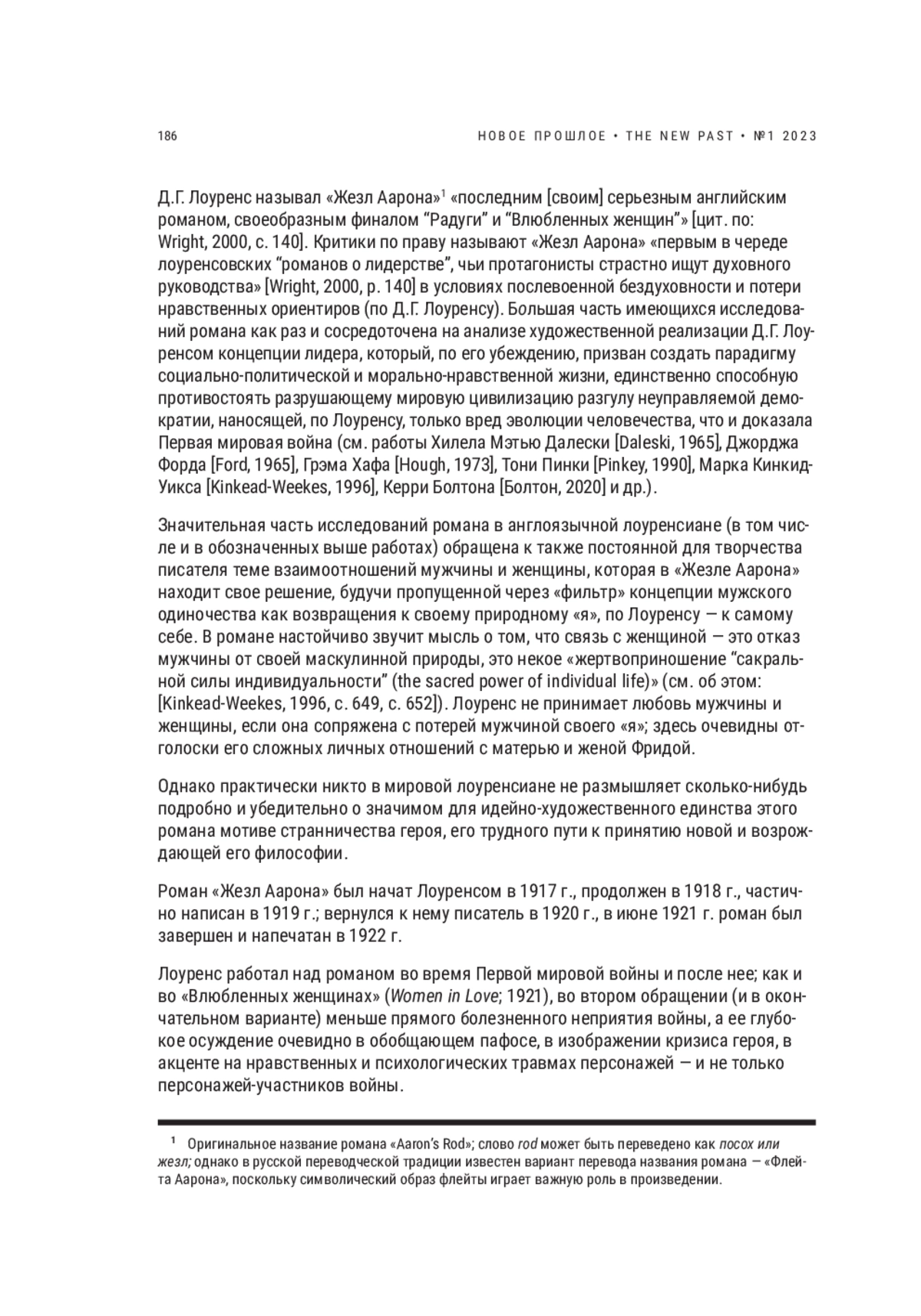 Д. Г. Лоуренс называл «Жезл Аарона» 1 «последним [своим] серьезным английским романом, своеобразным финалом “Радуги” и “Влюбленных женщин”» [цит. по: Wright, 2000, с. 140]. Критики по праву называют «Жезл Аарона» «первым в череде лоуренсовских “романов о лидерстве”, чьи протагонисты страстно ищут духовного руководства» [Wright, 2000, p. 140] в условиях послевоенной бездуховности и потери нравственных ориентиров (по Д. Г. Лоуренсу). Большая часть имеющихся исследований романа как раз и сосредоточена на анализе художественной реализации Д. Г. Лоуренсом концепции лидера, который, по его убеждению, призван создать парадигму социально-политической и морально-нравственной жизни, единственно способную противостоять разрушающему мировую цивилизацию разгулу неуправляемой демократии, наносящей, по Лоуренсу, только вред эволюции человечества, что и доказала Первая мировая война (см. работы Хилела Мэтью Далески [Daleski, 1965], Джорджа Форда [Ford, 1965], Грэма Хафа [Hough, 1973], Тони Пинки [Pinkey, 1990], Марка КинкидУикса [Kinkead-Weekes, 1996], Керри Болтона [Болтон, 2020] и др.).