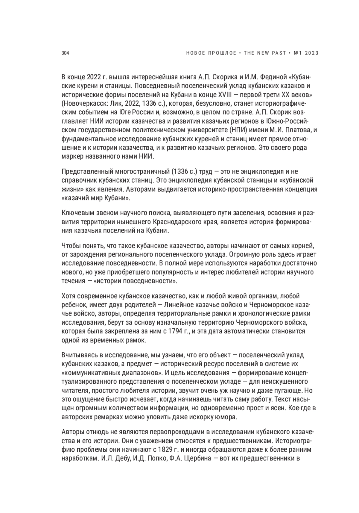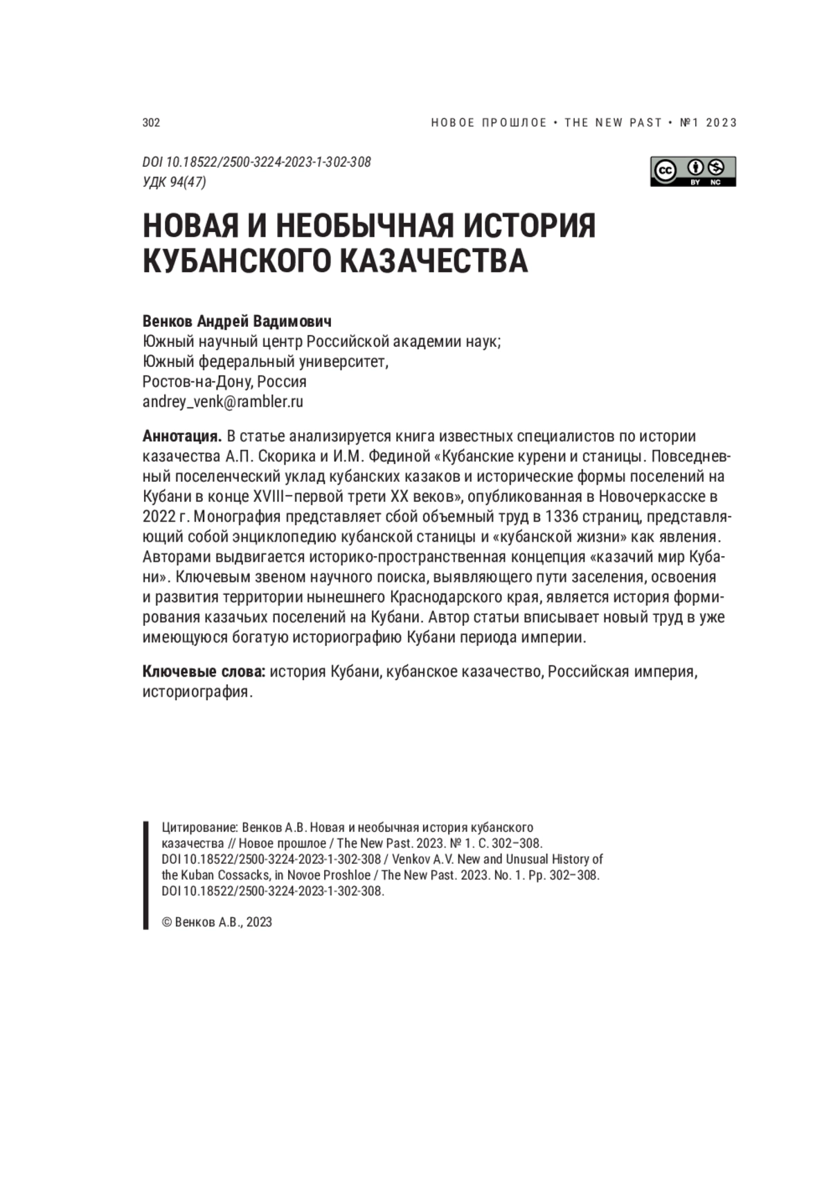 ВЕНКОВ А. В. НОВАЯ И НЕОБЫЧНАЯ ИСТОРИЯ КУБАНСКОГО КАЗАЧЕСТВА // НОВОЕ ПРОШЛОЕ. 2023. № 1